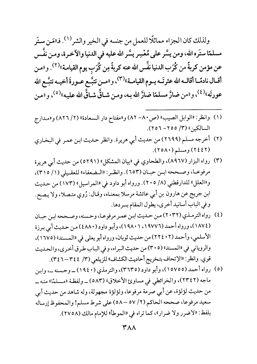 ولذلك كان الجزاء مماثلًا للعمل من جنسه في الخير والشر (¬١). فـ"مَن ستَر مسلمًا ستَره الله، ومن يسَّر على مُعْسِر يسَّر الله عليه في الدنيا والآخرة، ومن نفَّس عن مؤمن كربةً من كُرَب الدنيا نفَّس الله عنه كربةً مِن كُرَبِ يوم القيامة" (¬٢). و"من أقال نادمًا أقاله الله عثرتَه يوم القيامة" (¬٣)، و"من تتبَّع عورةَ أخيه تتبَّع الله عورتَه" (¬٤)، و"من ضارَّ مسلمًا ضارَّ الله به، ومن شاقَّ شاقَّ الله عليه" (¬٥)، و"من