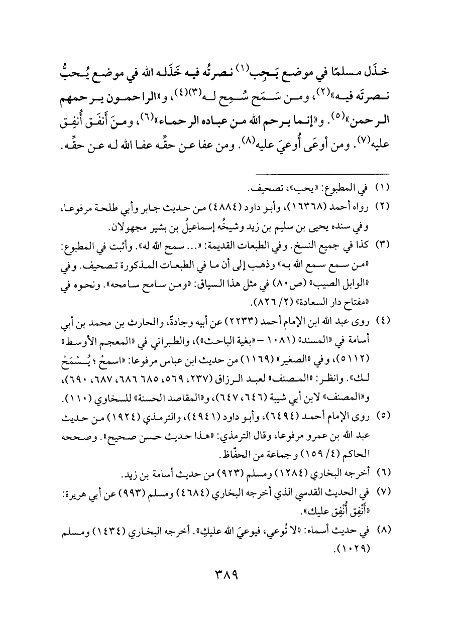 خذَل مسلمًا في موضع يَجِب (¬١) نصرتُه فيه خَذَله الله في موضع يُحبُّ نصرتَه فيه" (¬٢)، ومن سَمَح سُمِح له (¬٣) (¬٤)، و"الراحمون يرحمهم الرحمن" (¬٥).
