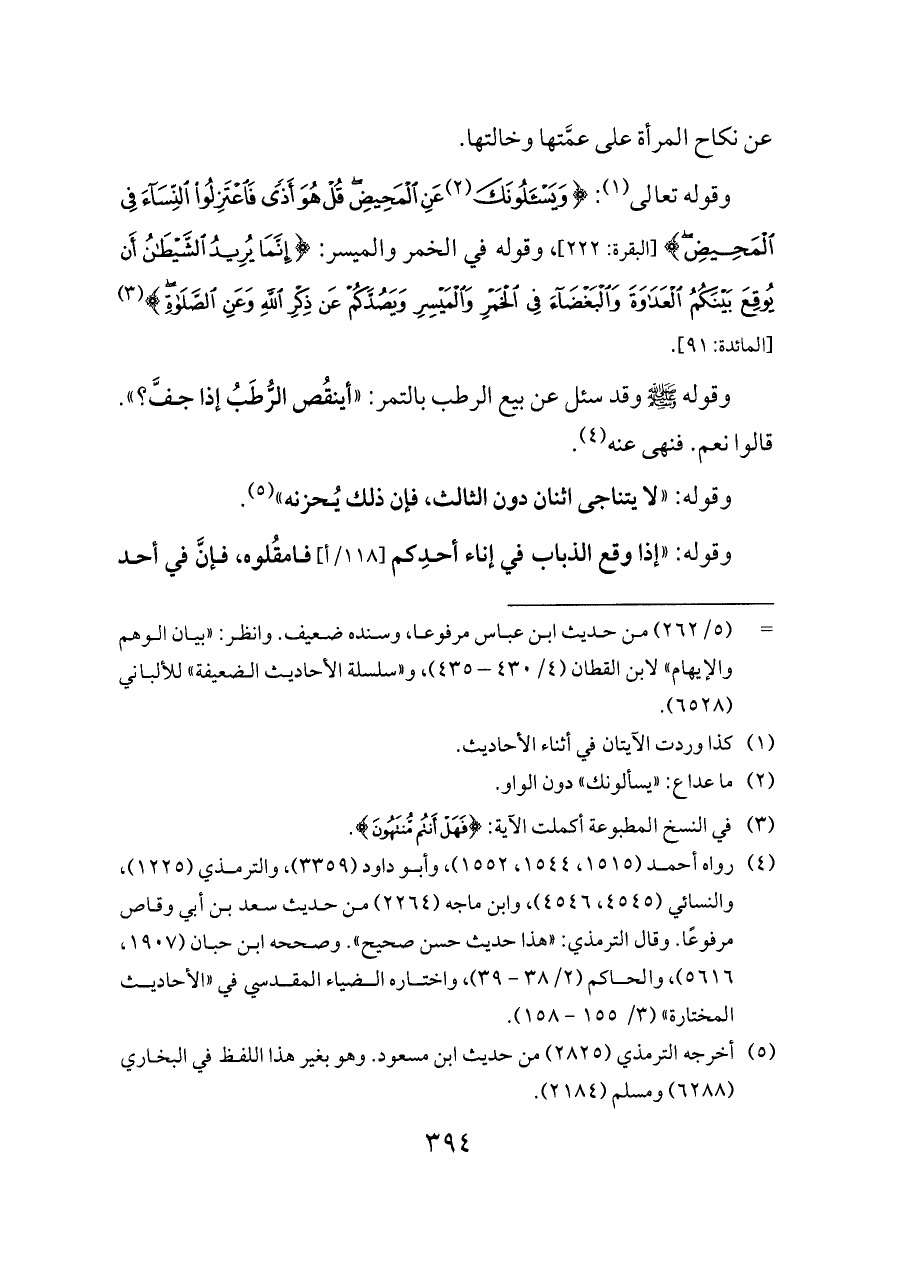 وقوله تعالى (¬١): {وَيَسْأَلُونَكَ (¬٢) عَنِ الْمَحِيضِ قُلْ هُوَ أَذًى فَاعْتَزِلُوا النِّسَاءَ فِي الْمَحِيضِ} [البقرة: ٢٢٢]، وقوله في الخمر والميسر: {إِنَّمَا يُرِيدُ الشَّيْطَانُ أَنْ يُوقِعَ بَيْنَكُمُ الْعَدَاوَةَ وَالْبَغْضَاءَ فِي الْخَمْرِ وَالْمَيْسِرِ وَيَصُدَّكُمْ عَنْ ذِكْرِ اللَّهِ وَعَنِ الصَّلَاةِ} (¬٣) [المائدة: ٩١].