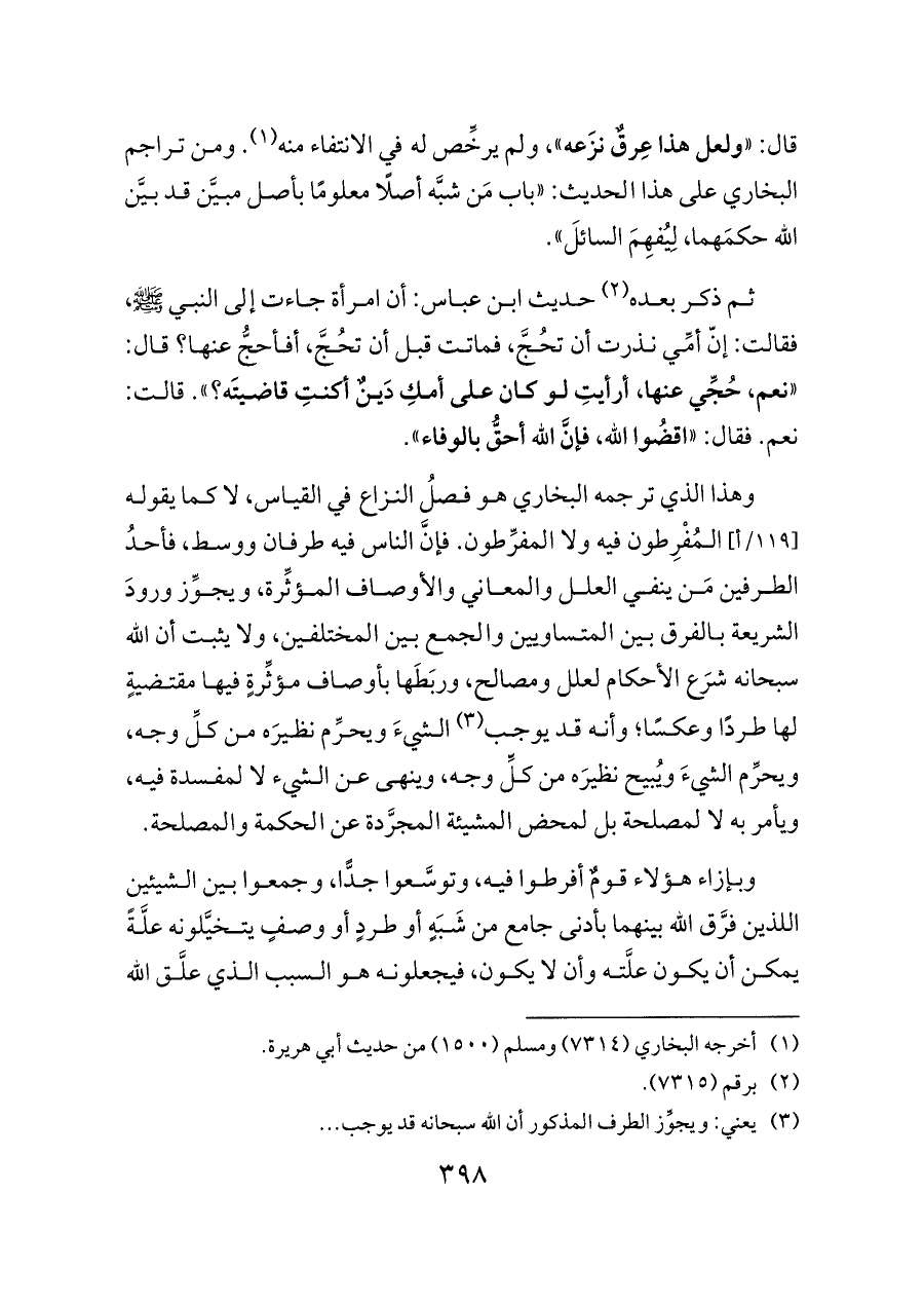 وهذا الذي ترجمه البخاري هو فصلُ النزاع في القياس، لا كما يقوله [١١٩/أ] المُفْرِطون فيه ولا المفرِّطون. فإنَّ الناس فيه طرفان ووسط، فأحدُ الطرفين مَن ينفي العلل والمعاني والأوصاف المؤثِّرة، ويجوِّز ورودَ الشريعة بالفرق بين المتساويين والجمع بين المختلفين، ولا يثبت أن الله سبحانه شرَع الأحكام لعلل ومصالح، وربَطَها بأوصاف مؤثِّرةٍ فيها مقتضيةٍ لها طردًا وعكسًا؛ وأنه قد يوجب (¬٣) الشيءَ ويحرِّم نظيرَه من كلِّ وجه، ويحرِّم الشيءَ ويُبيح نظيرَه من كلِّ وجه، وينهى عن الشيء لا لمفسدة فيه، ويأمر به لا لمصلحة بل لمحض المشيئة المجرَّدة عن الحكمة والمصلحة.