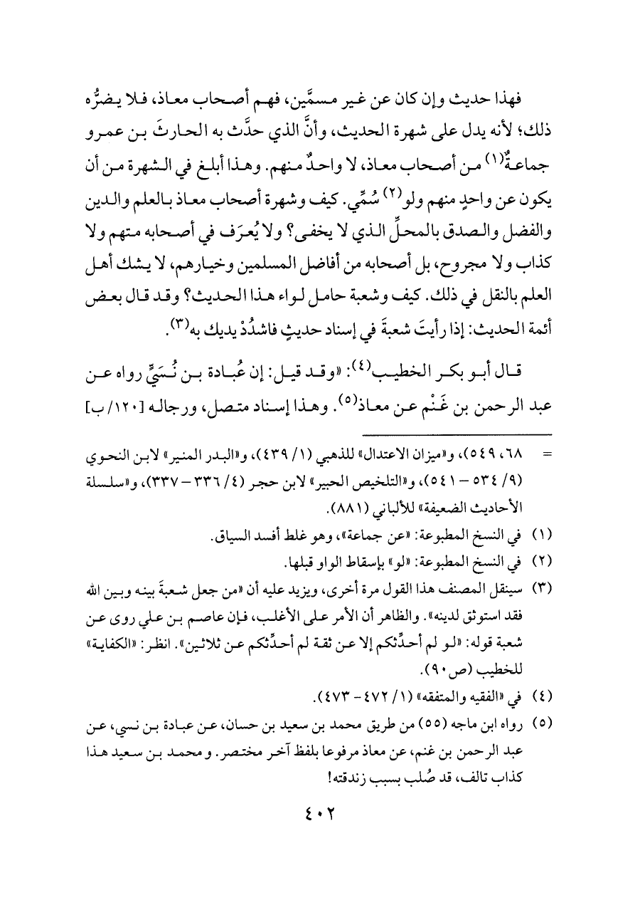 فهذا حديث وإن كان عن غير مسمَّين، فهم أصحاب معاذ، فلا يضرُّه ذلك؛ لأنه يدل على شهرة الحديث، وأنَّ الذي حدَّث به الحارثَ بن عمرو جماعةٌ (¬١) من أصحاب معاذ، لا واحدٌ منهم. وهذا أبلغ في الشهرة من أن يكون عن واحدٍ منهم ولو (¬٢) سُمِّي. كيف وشهرة أصحاب معاذ بالعلم والدين والفضل والصدق بالمحلِّ الذي لا يخفى؟ ولا يُعرَف في أصحابه متهم ولا كذاب ولا مجروح، بل أصحابه من أفاضل المسلمين وخيارهم، لا يشك أهل العلم بالنقل في ذلك. كيف وشعبة حامل لواء هذا الحديث؟ وقد قال بعض أئمة الحديث: إذا رأيتَ شعبةَ في إسناد حديثٍ فاشدُدْ يديك به (¬٣).