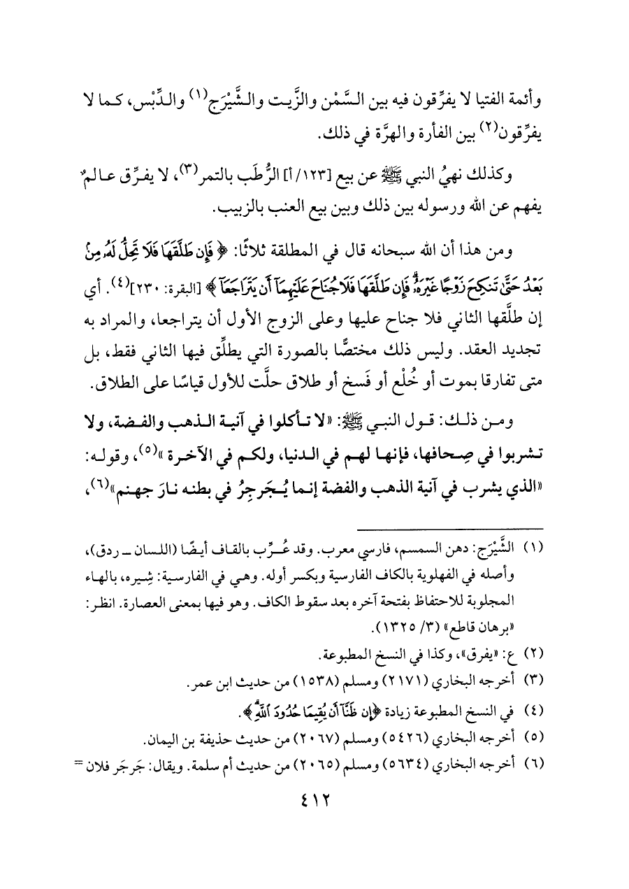 ومن هذا أن الله سبحانه قال في المطلقة ثلاثًا: {فَإِنْ طَلَّقَهَا فَلَا تَحِلُّ لَهُ مِنْ بَعْدُ حَتَّى تَنْكِحَ زَوْجًا غَيْرَهُ فَإِنْ طَلَّقَهَا فَلَا جُنَاحَ عَلَيْهِمَا أَنْ يَتَرَاجَعَا} [البقرة: ٢٣٠] (¬٤). أي إن طلَّقها الثاني فلا جناح عليها وعلى الزوج الأول أن يتراجعا، والمراد به تجديد العقد. وليس ذلك مختصًّا بالصورة التي يطلِّق فيها الثاني فقط، بل متى تفارقا بموت أو خُلْع أو فَسخ أو طلاق حلَّت للأول قياسًا على الطلاق.