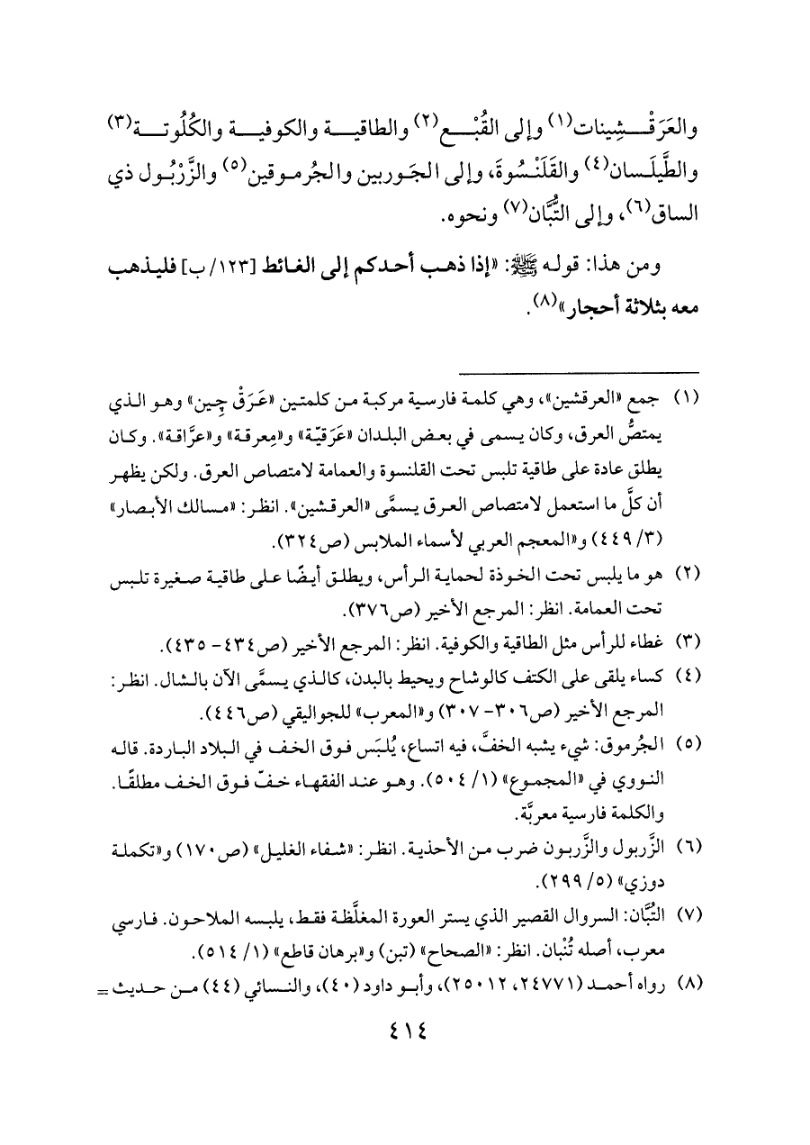 وإلى القُبْع (¬٢) والطاقية والكوفية والكُلُوتة (¬٣) والطَّيلَسان (¬٤) والقَلَنْسُوةَ، وإلى الجَوربين والجُرموقين (¬٥) والزَّرْبُول ذي الساق (¬٦)، وإلى التُّبَّان (¬٧) ونحوه.