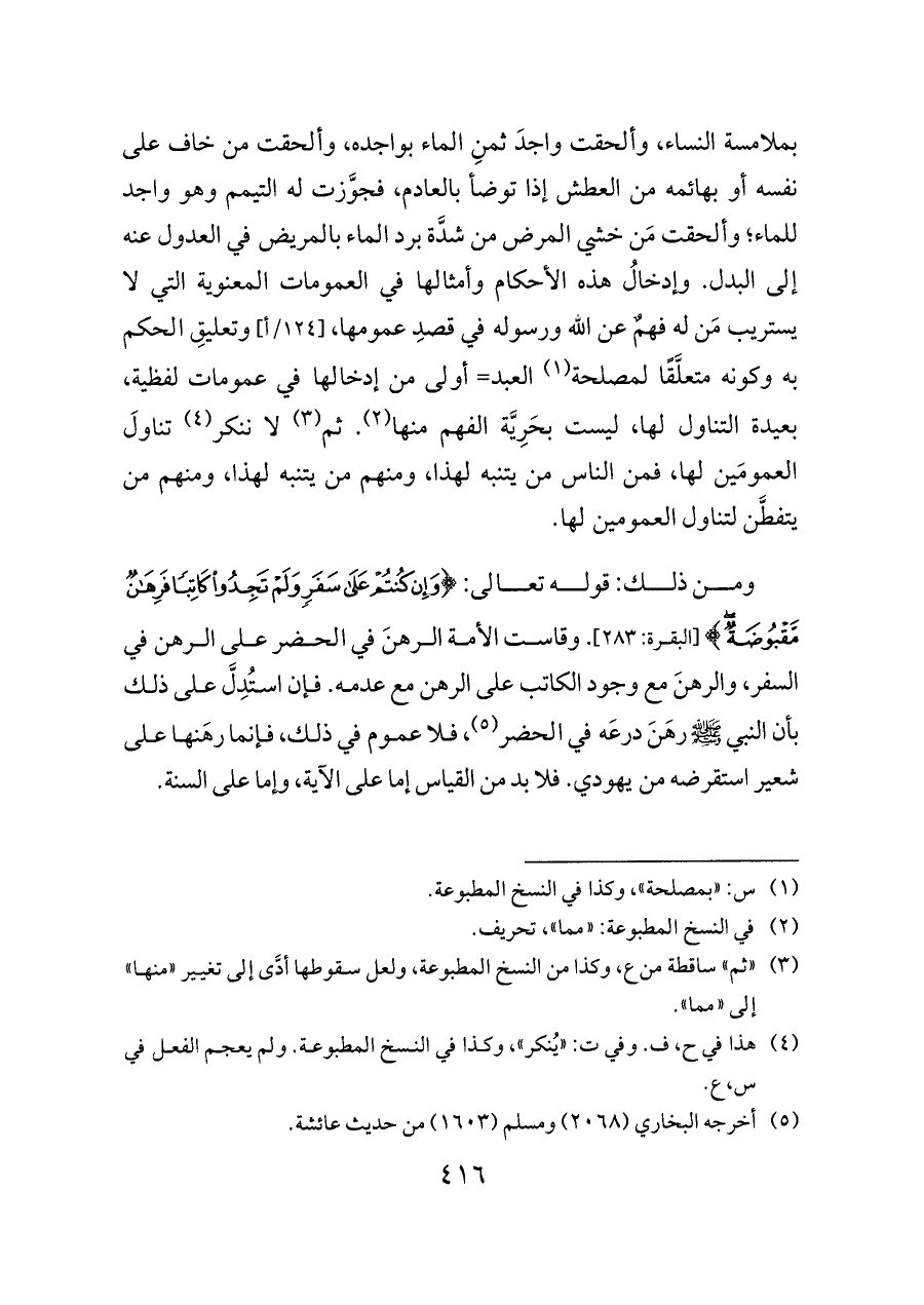 ومن ذلك: قوله تعالى: {وَإِنْ كُنْتُمْ عَلَى سَفَرٍ وَلَمْ تَجِدُوا كَاتِبًا فَرِهَانٌ مَقْبُوضَةٌ} [البقرة: ٢٨٣]. وقاست الأمة الرهنَ في الحضر على الرهن في السفر، والرهنَ مع وجود الكاتب على الرهن مع عدمه. فإن استُدِلَّ على ذلك بأن النبي - صلى الله عليه وسلم - رهَنَ درعَه في الحضر (¬٥)، فلا عموم في ذلك، فإنما رهَنها على شعير استقرضه من يهودي. فلا بد من القياس إما على الآية، وإما على السنة.