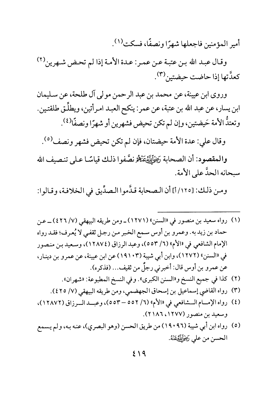 وروى ابن عيينة، عن محمد بن عبد الرحمن مولى آل طلحة، عن سليمان ابن يسار، عن عبد الله بن عتبة، عن عمر: ينكح العبد امرأتين، ويطلِّق طلقتين. وتعتدُّ الأمة حَيضتين، وإن لم تكن تحيض فشهرين أو شهرًا ونصفًا (¬٤).