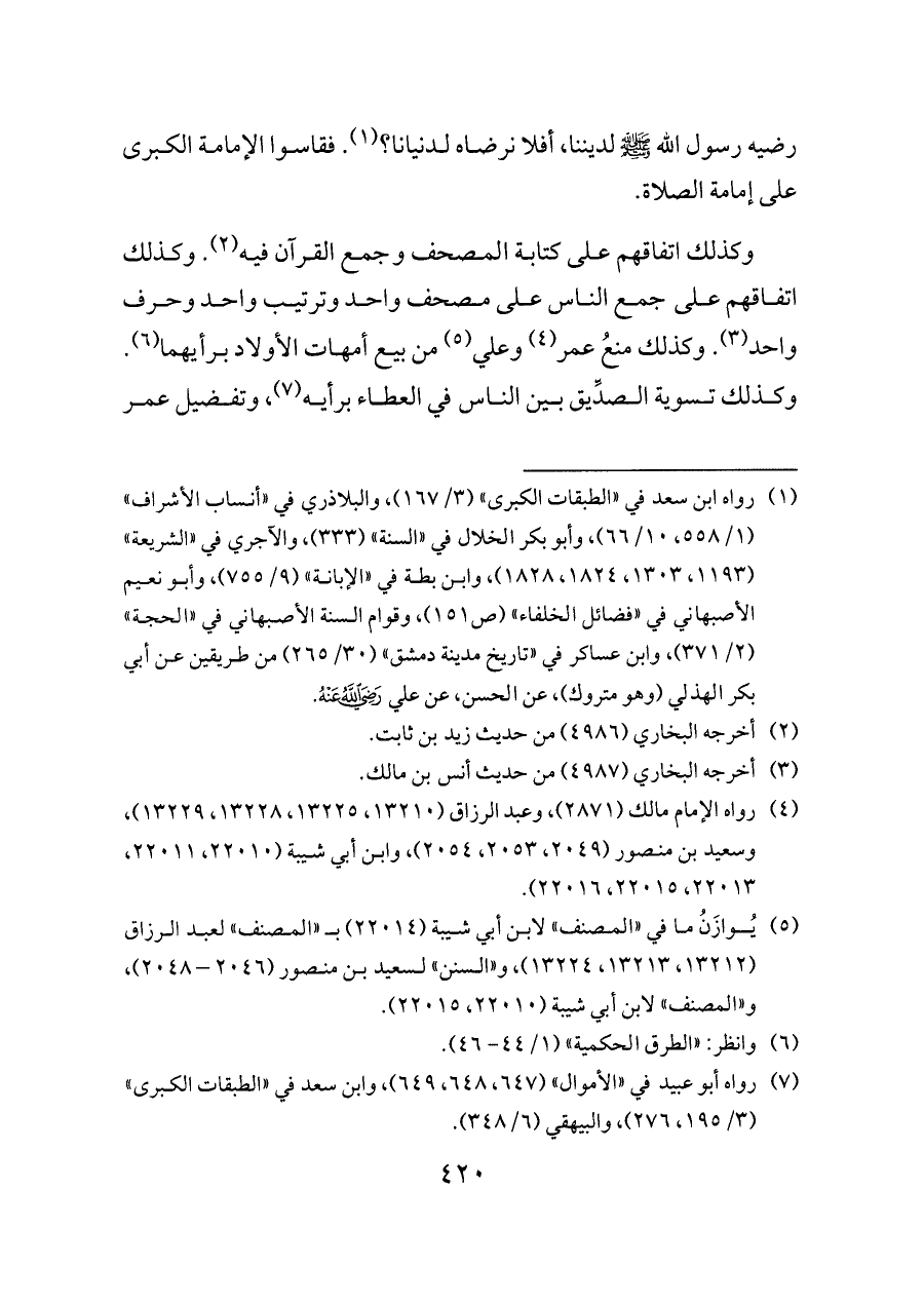 وكذلك اتفاقهم على كتابة المصحف وجمع القرآن فيه (¬٢). وكذلك اتفاقهم على جمع الناس على مصحف واحد وترتيب واحد وحرف واحد (¬٣). وكذلك منعُ عمر (¬٤) وعلي (¬٥) من بيع أمهات الأولاد برأيهما (¬٦). وكذلك تسوية الصدِّيق بين الناس في العطاء برأيه (¬٧)، وتفضيل عمر