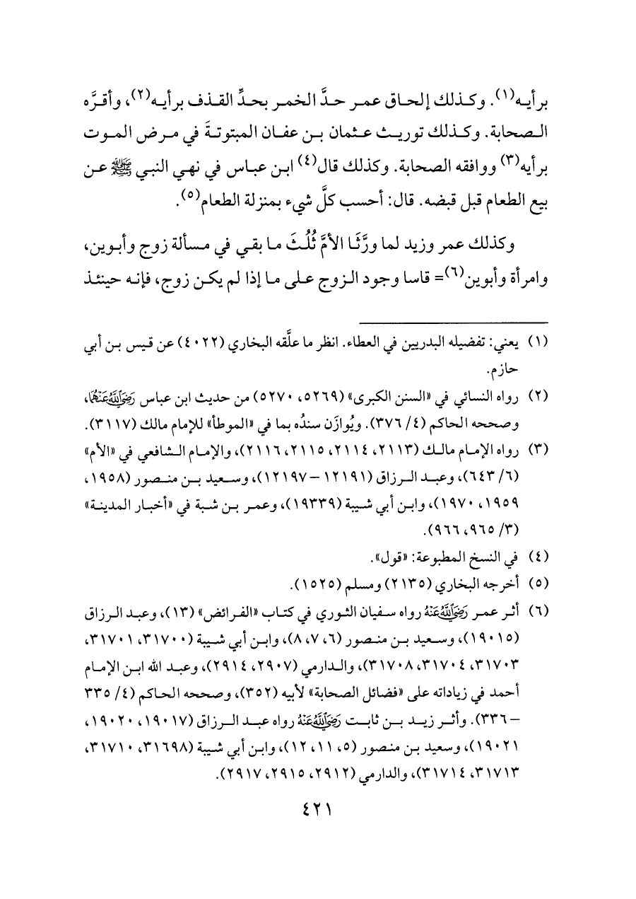 (¬٦) أثر عمر - رضي الله عنه - رواه سفيان الثوري في كتاب "الفرائض" (١٣)، وعبد الرزاق (١٩٠١٥)، وسعيد بن منصور (٦، ٧، ٨)، وابن أبي شيبة (٣١٧٠٠، ٣١٧٠١، ٣١٧٠٣، ٣١٧٠٤، ٣١٧٠٨)، والدارمي (٢٩٠٧، ٢٩١٤)، وعبد الله ابن الإمام أحمد في زياداته على "فضائل الصحابة" لأبيه (٣٥٢)، وصححه الحاكم (٤/ ٣٣٥ - ٣٣٦). وأثر زيد بن ثابت - رضي الله عنه - رواه عبد الرزاق (١٩٠١٧، ١٩٠٢٠، ١٩٠٢١)، وسعيد بن منصور (٥، ١١، ١٢)، وابن أبي شيبة (٣١٦٩٨، ٣١٧١٠، ٣١٧١٣، ٣١٧١٤)، والدارمي (٢٩١٢، ٢٩١٥، ٢٩١٧).