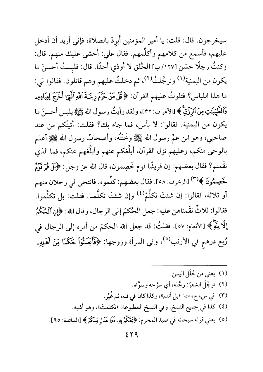 سيخرجون. قال: قلت: يا أمير المؤمنين أَبرِدْ بالصلاة، فإني أريد أن أدخل عليهم، فأسمع من كلامهم وأكلِّمهم. فقال علي: أخشى عليك منهم. قال: وكنتُ رجلًا حسَن [١٢٧/ب] الخُلق لا أوذي أحدًا. قال: فلبِستُ أحسنَ ما يكون من اليمنية (¬١) وترجَّلتُ (¬٢)، ثم دخلتُ عليهم وهم قائلون. فقالوا لي: ما هذا اللباس؟ فتلوتُ عليهم القرآن: {قُلْ مَنْ حَرَّمَ زِينَةَ اللَّهِ الَّتِي أَخْرَجَ لِعِبَادِهِ وَالطَّيِّبَاتِ مِنَ الرِّزْقِ} [الأعراف: ٣٢]، ولقد رأيتُ رسول الله - صلى الله عليه وسلم - يلبس أحسنَ ما يكون من اليمنية. فقالوا: لا بأس، فما جاء بك؟ فقلت: أتيتُكم من عند صاحبي، وهو ابن عمِّ رسول الله - صلى الله عليه وسلم - وخَتَنُه، وأصحابُ رسول الله - صلى الله عليه وسلم - أعلم بالوحي منكم، وعليهم نزل القرآن، أبلِّغكم عنهم وأبلِّغهم عنكم، فما الذي نقَمتم؟ فقال بعضهم: إن قريشًا قوم خَصِمون، قال الله عز وجل: {بَلْ هُمْ قَوْمٌ خَصِمُونَ} (¬٣) [الزخرف: ٥٨]. فقال بعضهم: كلِّموه.