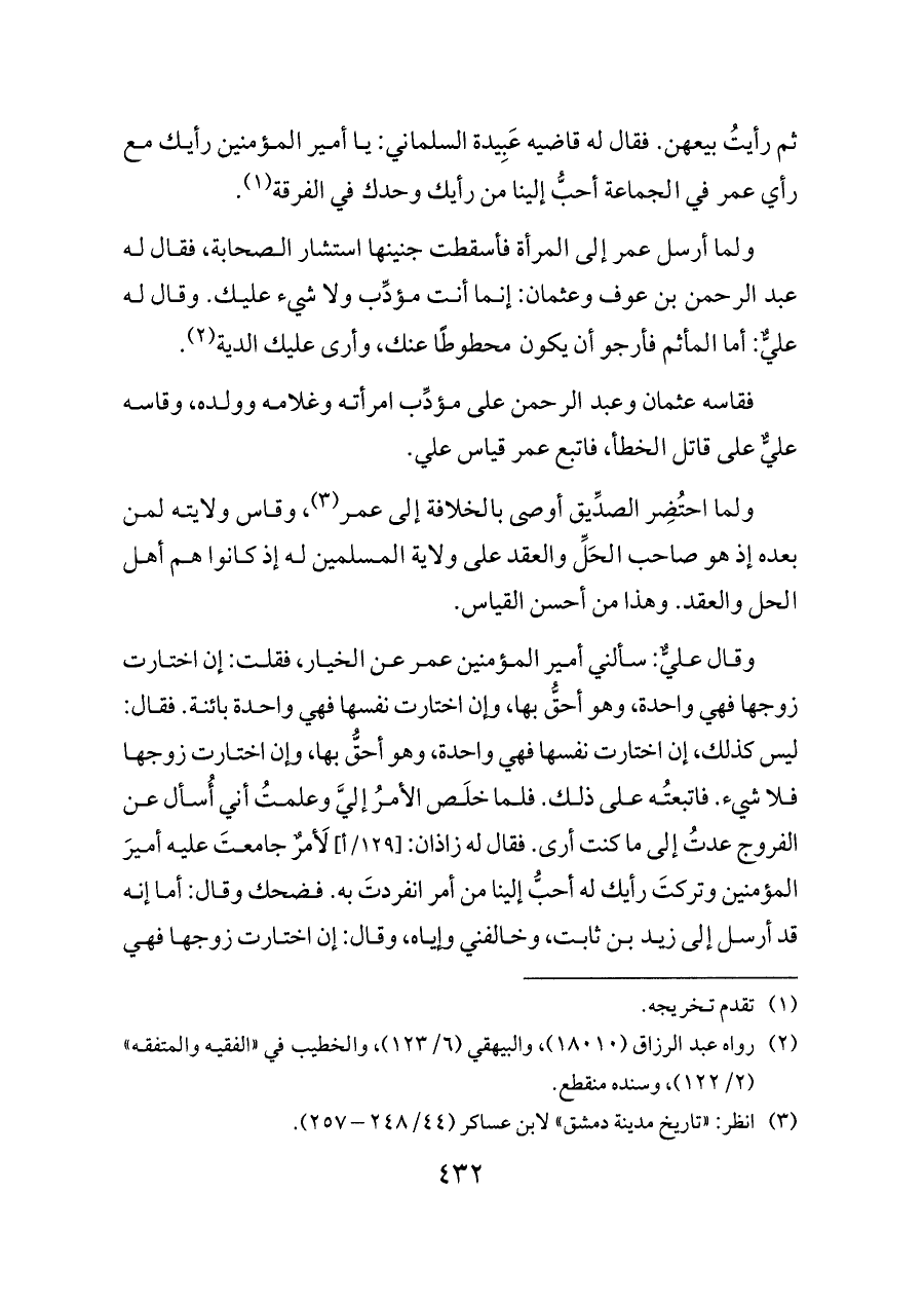 ثم رأيتُ بيعهن. فقال له قاضيه عَبِيدة السلماني: يا أمير المؤمنين رأيك مع رأي عمر في الجماعة أحبُّ إلينا من رأيك وحدك في الفرقة (¬١).