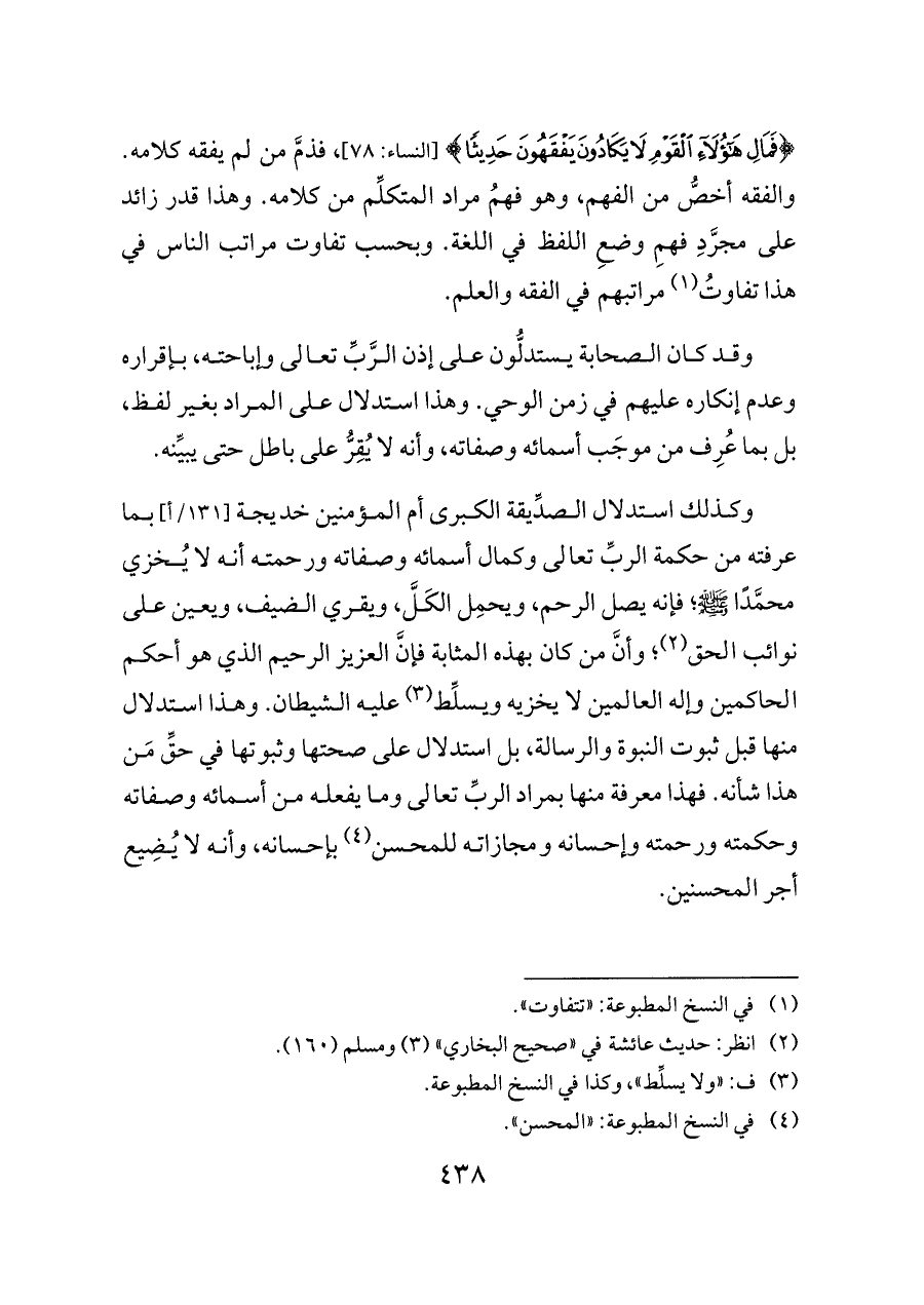 وكذلك استدلال الصدِّيقة الكبرى أم المؤمنين خديجة [١٣١/أ] بما عرفته من حكمة الربِّ تعالى وكمال أسمائه وصفاته ورحمته أنه لا يُخزي محمَّدًا - صلى الله عليه وسلم -؛ فإنه يصل الرحم، ويحمِل الكَلَّ، ويقري الضيف، ويعين على نوائب الحق (¬٢)؛ وأنَّ من كان بهذه المثابة فإنَّ العزيز الرحيم الذي هو أحكم الحاكمين وإله العالمين لا يخزيه ويسلِّط (¬٣) عليه الشيطان. وهذا استدلال منها قبل ثبوت النبوة والرسالة، بل استدلال على صحتها وثبوتها في حقِّ مَن هذا شأنه. فهذا معرفة منها بمراد الربِّ تعالى وما يفعله من أسمائه وصفاته وحكمته ورحمته وإحسانه ومجازاته للمحسن (¬٤) بإحسانه، وأنه لا يُضِيع أجر المحسنين.