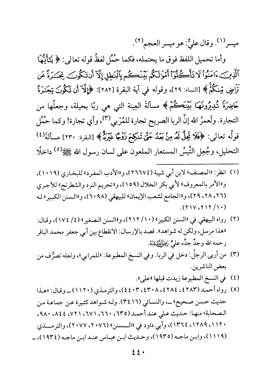 وأما تحميل اللفظ فوق ما يحتمله، فكما حُمِّل لفظُ قوله تعالى: {يَاأَيُّهَا الَّذِينَ آمَنُوا لَا تَأْكُلُوا أَمْوَالَكُمْ بَيْنَكُمْ بِالْبَاطِلِ إِلَّا أَنْ تَكُونَ تِجَارَةً عَنْ تَرَاضٍ مِنْكُمْ} [النساء: ٢٩]، وقوله في آية البقرة [٢٨٢]: {إِلَّا أَنْ تَكُونَ تِجَارَةً حَاضِرَةً تُدِيرُونَهَا بَيْنَكُمْ} مسألةَ العِينة التي هي ربًا بحيلة، وجعلُها من التجارة. ولَعمرُ الله إنَّ الربا الصريح تجارة للمُرْبي (¬٣)، وأي تجارة! وكما حُمِّل قولُه تعالى: {فَلَا تَحِلُّ لَهُ مِنْ بَعْدُ حَتَّى تَنْكِحَ زَوْجًا غَيْرَهُ} [البقرة: ٢٣٠] مسألةَ (¬٤) التحليل، وجُعِل التَّيسُ المستعار الملعون على لسان رسول الله - صلى الله عليه وسلم - (¬٥) داخلًا