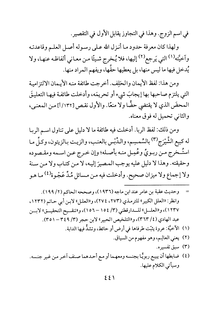 ومن ذلك: لفظ الربا. أدخلت فيه طائفة ما لا دليل على تناول اسم الربا له كبيع الشَّيْرَج (¬٣) بالسِّمسِم، والدِّبْس بالعنب، والزيت بالزيتون، وكلِّ ما استُخرج من ربويِّ وعُمِل منه بأصله؛ وإن خرج عن اسمه ومقصوده وحقيقته. وهذا لا دليل عليه يوجب المصيرَ إليه، لا من كتاب ولا من سنة ولا إجماع ولا ميزان صحيح. وأدخلت فيه من مسائل مُدِّ عَجْوة (¬٤) ما هو