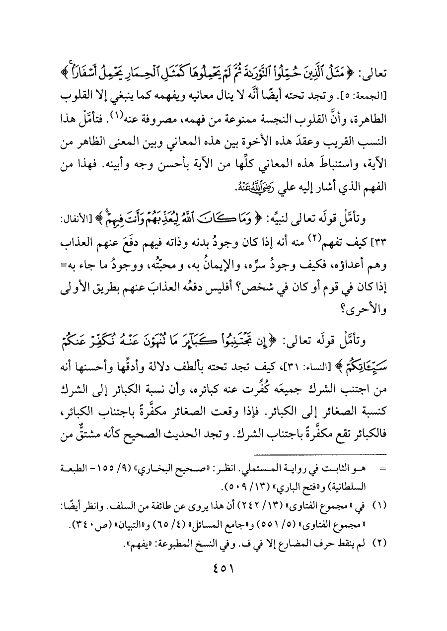 تعالى: {مَثَلُ الَّذِينَ حُمِّلُوا التَّوْرَاةَ ثُمَّ لَمْ يَحْمِلُوهَا كَمَثَلِ الْحِمَارِ يَحْمِلُ أَسْفَارًا} [الجمعة: ٥]. وتجد تحته أيضًا أنَّه لا ينال معانيه ويفهمه كما ينبغي إلا القلوب الطاهرة، وأنَّ القلوب النجسة ممنوعة من فهمه، مصروفة عنه (¬١). فتأمَّلْ هذا النسب القريب وعقدَ هذه الأخوة بين هذه المعاني وبين المعنى الظاهر من الآية، واستنباطَ هذه المعاني كلِّها من الآية بأحسن وجه وأبينه. فهذا من الفهم الذي أشار إليه علي - رضي الله عنه -.