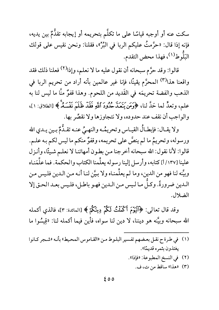 ولا يقال: فإبطالُ القياس وتحريمُه والنهيُ عنه تقدُّمٌ بين يدي الله ورسوله، وتحريمُ ما لم ينصَّ على تحريمه، وقفوٌ منكم ما ليس لكم به علم. قالوا: لأنا نقول: الله سبحانه أخرجنا من بطون أمهاتنا لا نعلم شيئًا، وأنزل علينا [١٣٧/أ] كتابه، وأرسل إلينا رسوله يعلِّمنا الكتاب والحكمة. فما علَّمَناه وبيَّنه لنا فهو من الدين، وما لم يعلِّمناه ولا بيَّن لنا أنه من الدين فليس من الدين ضرورةً. وكلُّ ما ليس من الدين فهو باطل، فليس بعد الحق إلا الضلال.