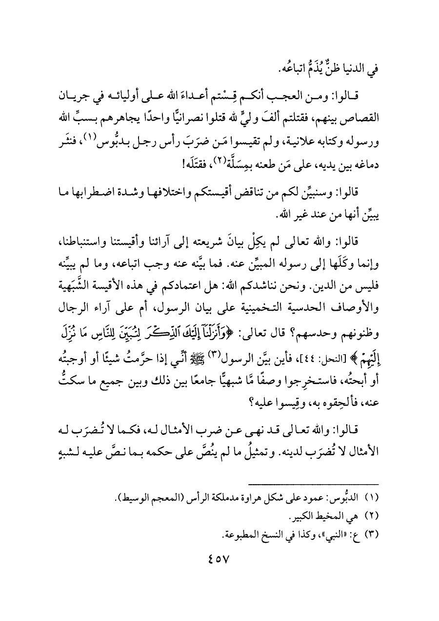 قالوا: ومن العجب أنكم قِسْتم أعداءَ الله على أوليائه في جريان القصاص بينهم، فقتلتم ألفَ وليٍّ لله قتلوا نصرانيًّا واحدًا يجاهرهم بسبِّ الله ورسوله وكتابه علانية، ولم تقيسوا مَن ضرَبَ رأس رجل بدبُّوس (¬١)، فنثَر دماغه بين يديه، على مَن طعنه بمِسَلَّة (¬٢)، فقتَلَه!