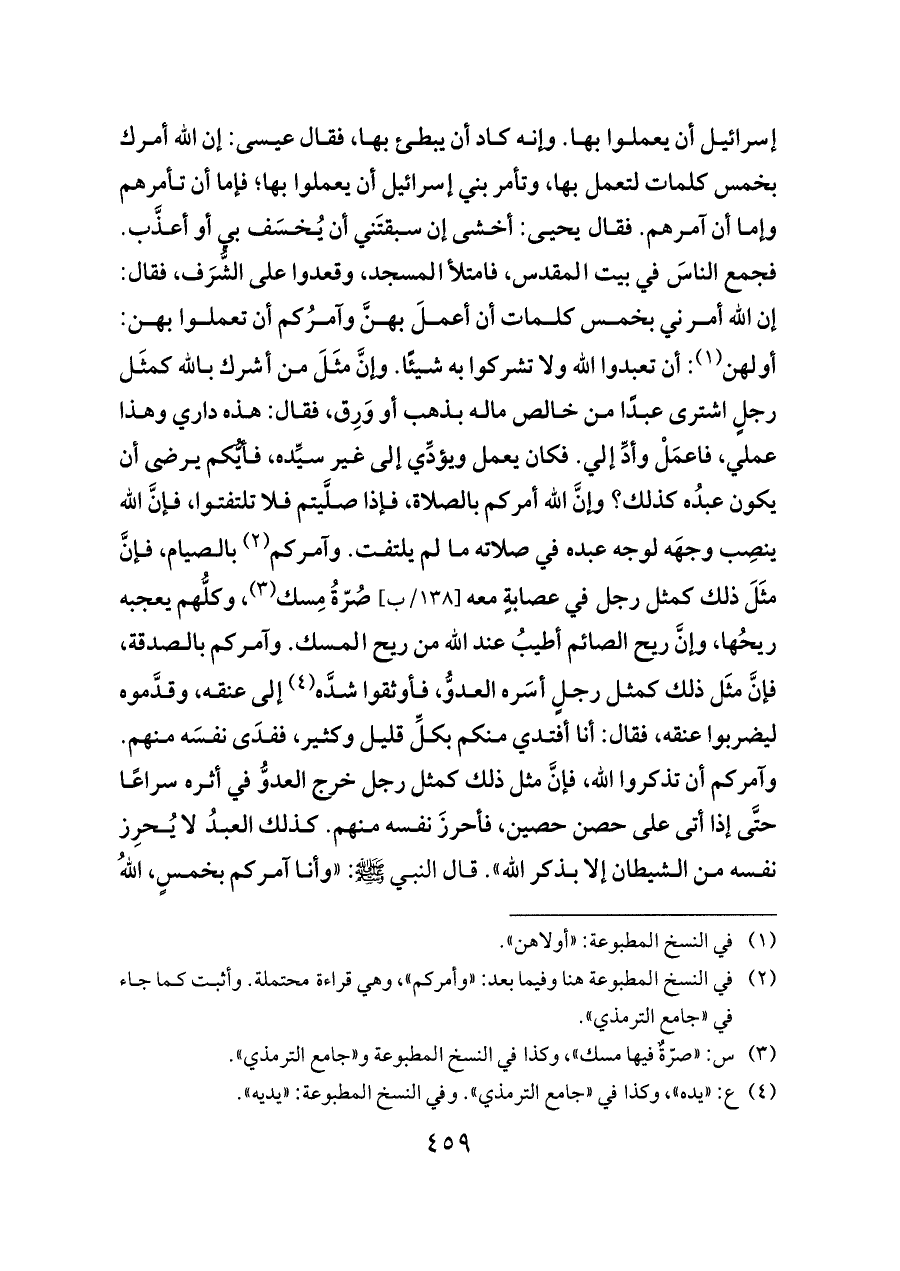 إسرائيل أن يعملوا بها. وإنه كاد أن يبطئ بها، فقال عيسى: إن الله أمرك بخمس كلمات لتعمل بها، وتأمر بني إسرائيل أن يعملوا بها؛ فإما أن تأمرهم وإما أن آمرهم. فقال يحيى: أخشى إن سبقتَني أن يُخسَف بي أو أعذَّب. فجمع الناسَ في بيت المقدس، فامتلأ المسجد، وقعدوا على الشُّرَف، فقال: إن الله أمرني بخمس كلمات أن أعملَ بهنَّ وآمرُكم أن تعملوا بهن: أولهن (¬١): أن تعبدوا الله ولا تشركوا به شيئًا. وإنَّ مثَلَ من أشرك بالله كمثَل رجلٍ اشترى عبدًا من خالص ماله بذهب أو وَرِق، فقال: هذه داري وهذا عملي، فاعمَلْ وأدِّ إلي. فكان يعمل ويؤدِّي إلى غير سيِّده، فأيُّكم يرضى أن يكون عبدُه كذلك؟ وإنَّ الله أمركم بالصلاة، فإذا صلَّيتم فلا تلتفتوا، فإنَّ الله ينصِب وجهَه لوجه عبده في صلاته ما لم يلتفت. وآمركم (¬٢) بالصيام، فإنَّ مثَلَ ذلك كمثل رجل في عصابةٍ معه [١٣٨/ب] صُرّةُ مِسك (¬٣)، وكلُّهم يعجبه ريحُها، وإنَّ ريح الصائم أطيبُ عند الله من ريح المسك. وآمركم بالصدقة، فإنَّ مثَل ذلك كمثل رجلٍ أسَره العدوُّ، فأوثقوا شدَّه (¬٤)