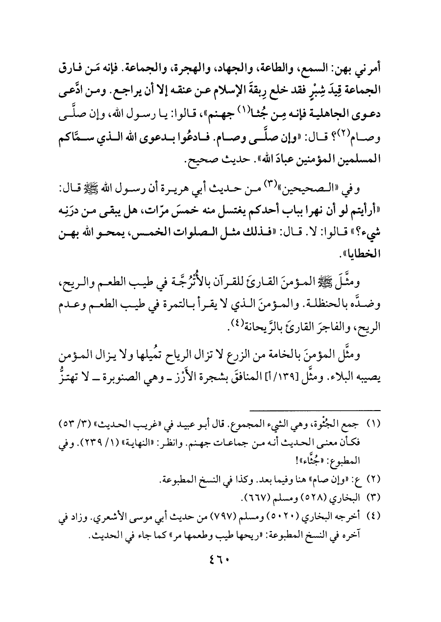 أمرني بهن: السمع، والطاعة، والجهاد، والهجرة، والجماعة. فإنه مَن فارق الجماعة قِيدَ شِبْرٍ فقد خلع رِبقةَ الإسلام عن عنقه إلا أن يراجع. ومن ادَّعى دعوى الجاهلية فإنه مِن جُثا (¬١) جهنم"، قالوا: يا رسول الله، وإن صلَّى وصام (¬٢)؟ قال: "وإن صلَّى وصام. فادعُوا بدعوى الله الذي سمَّاكم المسلمين المؤمنين عبادَ الله". حديث صحيح.