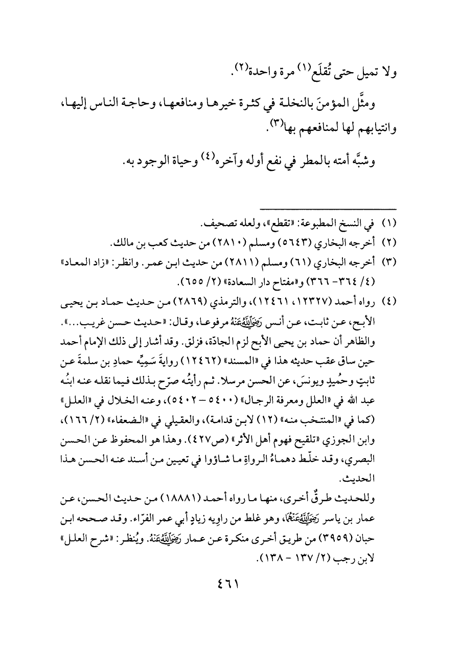 (¬٤) رواه أحمد (١٢٣٢٧، ١٢٤٦١)، والترمذي (٢٨٦٩) من حديث حماد بن يحيى الأبح، عن ثابت، عن أنس - رضي الله عنه - مرفوعا، وقال: "حديث حسن غريب ... ". والظاهر أن حماد بن يحيى الأبح لزم الجادّة، فزلق. وقد أشار إلى ذلك الإمام أحمد حين ساق عقب حديثه هذا في "المسند" (١٢٤٦٢) روايةَ سَمِيِّه حمادِ بن سلمةَ عن ثابتٍ وحُميدٍ ويونسَ، عن الحسن مرسلا. ثم رأيتُه صرّح بذلك فيما نقله عنه ابنُه عبد الله في "العلل ومعرفة الرجال" (٥٤٠٠ - ٥٤٠٢)، وعنه الخلال في "العلل" (كما في "المنتخب منه" (١٢) لابن قدامة)، والعقيلي في "الضعفاء" (٢/ ١٦٦)، وابن الجوزي "تلقيح فهوم أهل الأثر" (ص ٤٢٧). وهذا هو المحفوظ عن الحسن البصري، وقد خلّط دهماءُ الرواةِ ما شاؤوا في تعيين من أسند عنه الحسن هذا الحديث.