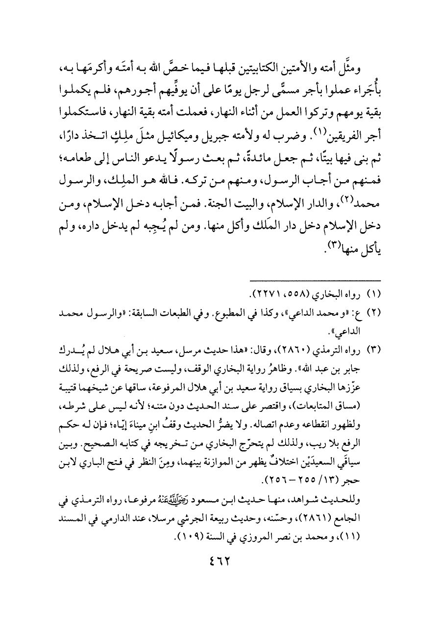 ومثَّل أمته والأمتين الكتابيتين قبلها فيما خصَّ الله به أمتَه وأكرمَها به، بأُجَراء عملوا بأجر مسمًّى لرجل يومًا على أن يوفِّيهم أجورهم، فلم يكملوا بقية يومهم وتركوا العمل من أثناء النهار، فعملت أمته بقية النهار، فاستكملوا أجر الفريقين (¬١). وضرب له ولأمته جبريل وميكائيل مثلَ ملِكٍ اتخذ دارًا، ثم بنى فيها بيتًا، ثم جعل مائدةً، ثم بعث رسولًا يدعو الناس إلى طعامه؛ فمنهم من أجاب الرسول، ومنهم من تركه. فالله هو الملِك، والرسول محمد (¬٢)، والدار الإسلام، والبيت الجنة. فمن أجابه دخل الإسلام، ومن دخل الإسلام دخل دار المَلك وأكل منها. ومن لم يُجِبه لم يدخل داره، ولم يأكل منها (¬٣).