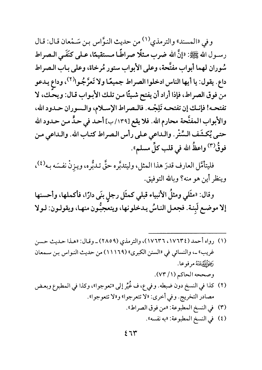 وفي "المسند" والترمذي (¬١) من حديث النوَّاس بن سَمْعان قال: قال رسول الله - صلى الله عليه وسلم -: "إنَّ الله ضرب مثلًا صراطًا مستقيمًا، على كنَفَي الصراط سُوران لهما أبواب مفتَّحة، وعلى الأبواب ستور مُرخاة، وعلى باب الصراط داع. يقول: يا أيها الناس ادخلوا الصراط جميعًا ولا تَعرَّجُوا (¬٢)، وداعٍ يدعو من فوق الصراط، فإذا أراد أن يفتح شيئًا من تلك الأبواب قال: ويحك، لا تفتحه! فإنك إن تفتحه تَلِجْه. فالصراط الإسلام، والسوران حدود الله، والأبواب المفتَّحة محارم الله. فلا يقع [١٣٩/ب] أحد في حدٍّ من حدود الله حتى يُكشَف السِّتْر. والداعي على رأس الصراط كتاب الله. والداعي من فوقُ (¬٣) واعظُ الله في قلب كلِّ مسلم".