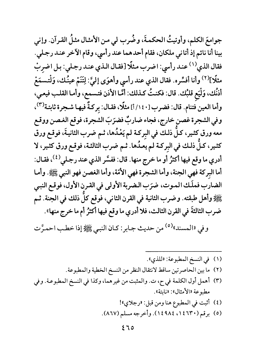 جوامعَ الكلم، وأوتيتُ الحكمةَ، وضُرب لي من الأمثال مثلُ القرآن. وإني بينا أنا نائم إذ أتاني ملكان، فقام أحدهما عند رأسي، وقام الآخر عند رجلي. فقال الذي (¬١) عند رأسي: اضرب مثلًا [فقال الذي عند رجلي: بل اضرِبْ مثلًا] (¬٢) وأنا أفسِّره. فقال الذي عند رأسي وأهوَى إليَّ: لِتَنَمْ عينُك، وَلْتسمَعْ أذنُك، وَلْيَعِ قلبُك. قال: فكنتُ كذلك: أمَّا الأذن فتسمع، وأما القلب فيعي، وأما العين فتنام. قال: فضرب [١٤٠/أ] مثلًا، فقال: بِركةٌ فيها شجرة ثابتة (¬٣)، وفي الشجرة غصن خارج، فجاء ضاربٌ فضرَبَ الشجرة، فوقع الغصن ووقع معه ورق كثير، كلُّ ذلك في البِركة لم يَعْدُها، ثم ضرب الثانيةَ، فوقع ورق كثير، كلُّ ذلك في البِركة لم يعدُها. ثم ضرب الثالثة، فوقع ورق كثير، لا أدري ما وقع فيها أكثرُ أو ما خرج منها.