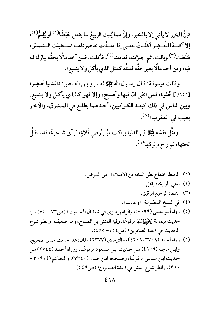 "إنَّ الخير لا يأتي إلا بالخير، وإنَّ مما يُنبت الربيعُ ما يقتل حَبَطًا (¬١) أو يُلِمُّ (¬٢)، إلا آكلةَ الخَضِر أكلَتْ حتى إذا امتدَّت خاصرتاها استقبلت الشمسَ، فثلَطت (¬٣) وبالت، ثم اجترَّت، فعادت (¬٤)، فأكلت. فمن أخذ مالًا بحقِّه يبارَك له فيه، ومن أخذ مالًا بغير حقِّه فمثلُه كمثل الذي يأكل ولا يشبع".