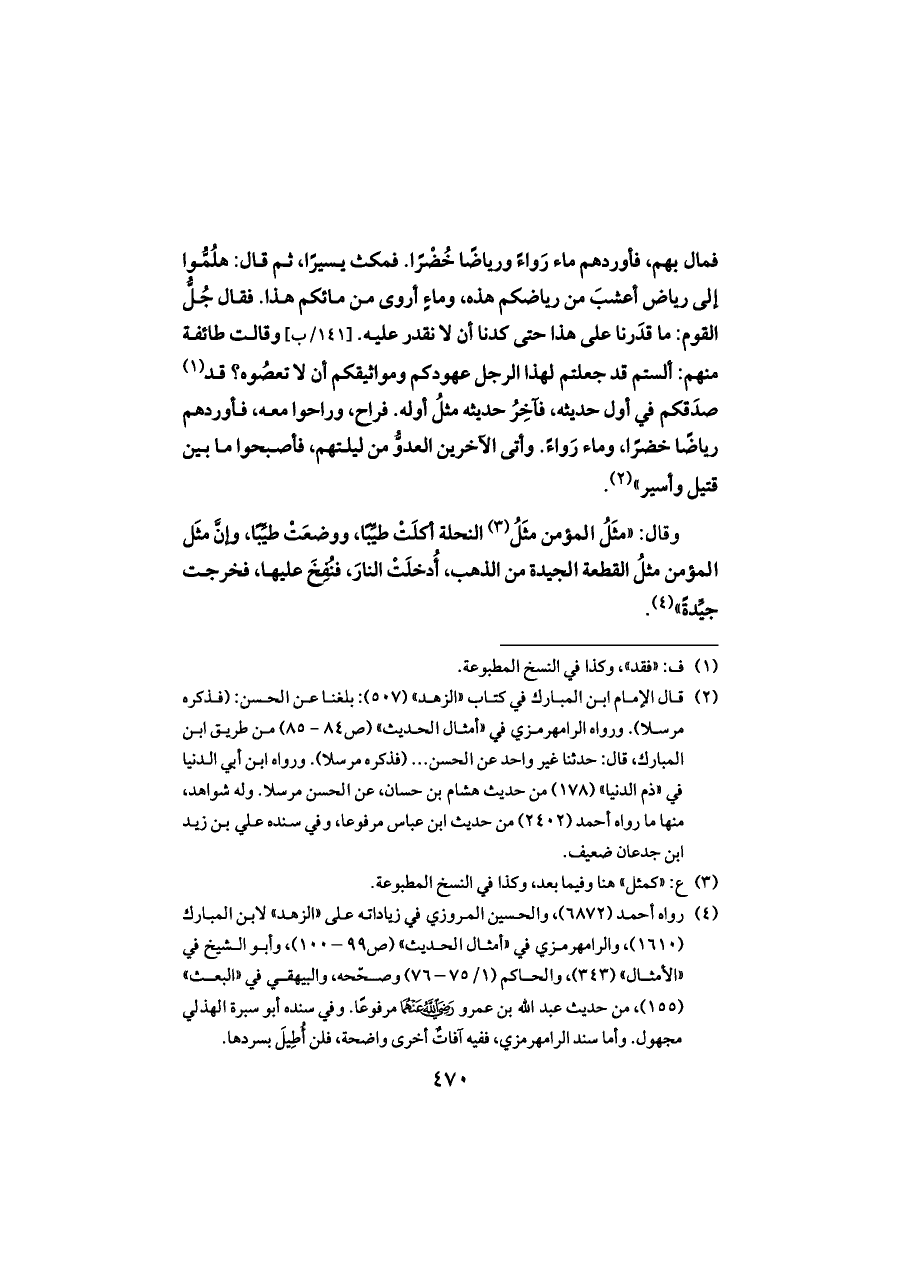 فمال بهم، فأوردهم ماء رَواءً ورياضًا خُضْرًا. فمكث يسيرًا، ثم قال: هلُمُّوا إلى رياض أعشبَ من رياضكم هذه، وماءٍ أروى من مائكم هذا. فقال جُلُّ القوم: ما قدَرنا على هذا حتى كدنا أن لا نقدر عليه. [١٤١/ب] وقالت طائفة منهم: ألستم قد جعلتم لهذا الرجل عهودكم ومواثيقكم أن لا تعصُوه؟ قد (¬١) صدَقكم في أول حديثه، فآخِرُ حديثه مثلُ أوله. فراح، وراحوا معه، فأوردهم رياضًا خضرًا، وماء رَواءً. وأتى الآخرين العدوُّ من ليلتهم، فأصبحوا ما بين قتيل وأسير" (¬٢).