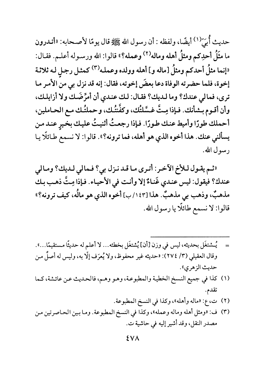 حديث أُبَيّ (¬١) أيضًا، ولفظه: أن رسول الله - صلى الله عليه وسلم - قال يومًا لأصحابه: "أتدرون ما مثَلُ أحدِكم ومثلُ أهله وماله (¬٢) وعمله؟ " قالوا: الله ورسوله أعلم. فقال: "إنما مثلُ أحدكم ومثلُ [ماله و] أهله وولده وعمله (¬٣) كمثل رجلٍ له ثلاثة إخوة، فلما حضرته الوفاة دعا بعضَ إخوته، فقال: إنه قد نزل بي من الأمر ما ترى، فمالي عندك؟ وما لديك؟ فقال: لك عندي أن أمرِّضَك ولا أزايلك، وأن أقوم بشأنك. فإذا مِتَّ غسَّلتُك، وكفَّنتُك، وحملتُك مع الحاملين، أحملك طورًا وأميط عنك طورًا. فإذا رجعتُ أثنيتُ عليك بخيرٍ عند من يسألني عنك. هذا أخوه الذي هو أهله، فما ترونه؟ ". قالوا: لا نسمع طائلًا يا رسول الله.