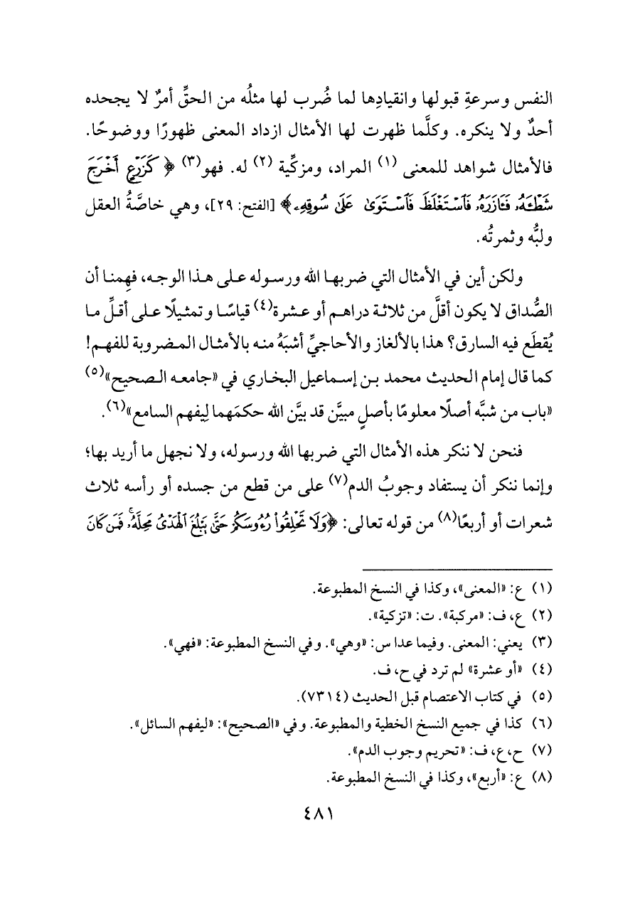 فنحن لا ننكر هذه الأمثال التي ضربها الله ورسوله، ولا نجهل ما أريد بها؛ وإنما ننكر أن يستفاد وجوبُ الدم (¬٧) على من قطع من جسده أو رأسه ثلاث شعرات أو أربعًا (¬٨) من قوله تعالى: {وَلَا تَحْلِقُوا رُءُوسَكُمْ حَتَّى يَبْلُغَ الْهَدْيُ مَحِلَّهُ فَمَنْ كَانَ