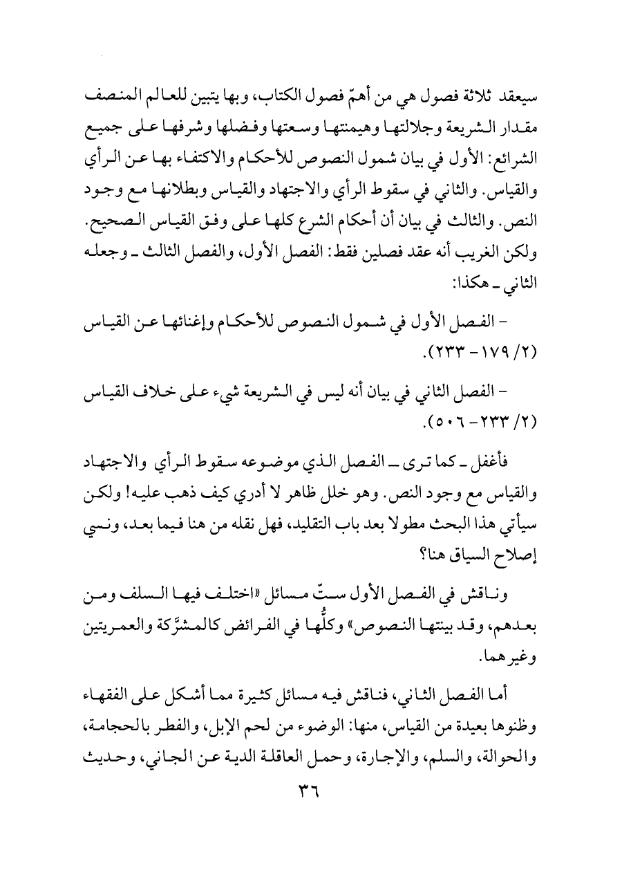 سيعقد ثلاثة فصول هي من أهمّ فصول الكتاب، وبها يتبين للعالم المنصف مقدار الشريعة وجلالتها وهيمنتها وسعتها وفضلها وشرفها على جميع الشرائع: الأول في بيان شمول النصوص للأحكام والاكتفاء بها عن الرأي والقياس. والثاني في سقوط الرأي والاجتهاد والقياس وبطلانها مع وجود النص. والثالث في بيان أن أحكام الشرع كلها على وفق القياس الصحيح. ولكن الغريب أنه عقد فصلين فقط: الفصل الأول، والفصل الثالث ــ وجعله الثاني ــ هكذا: