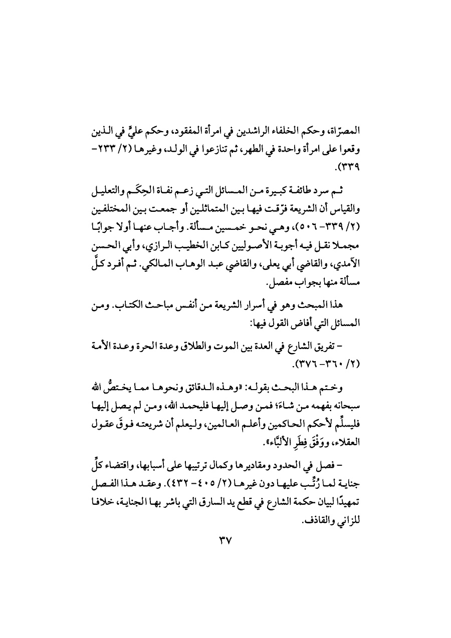 ثم سرد طائفة كبيرة من المسائل التي زعم نفاة الحِكَم والتعليل والقياس أن الشريعة فرّقت فيها بين المتماثلين أو جمعت بين المختلفين (٢/ ٣٣٩ - ٥٠٦)، وهي نحو خمسين مسألة. وأجاب عنها أولا جوابًا مجملا نقل فيه أجوبة الأصوليين كابن الخطيب الرازي، وأبي الحسن الآمدي، والقاضي أبي يعلى، والقاضي عبد الوهاب المالكي. ثم أفرد كلَّ مسألة منها بجواب مفصل.