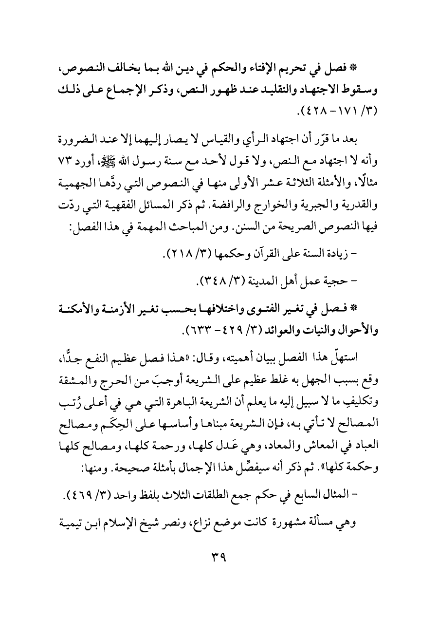 * فصل في تحريم الإفتاء والحكم في دين الله بما يخالف النصوص، وسقوط الاجتهاد والتقليد عند ظهور النص، وذكر الإجماع على ذلك (٣/ ١٧١ - ٤٢٨).
