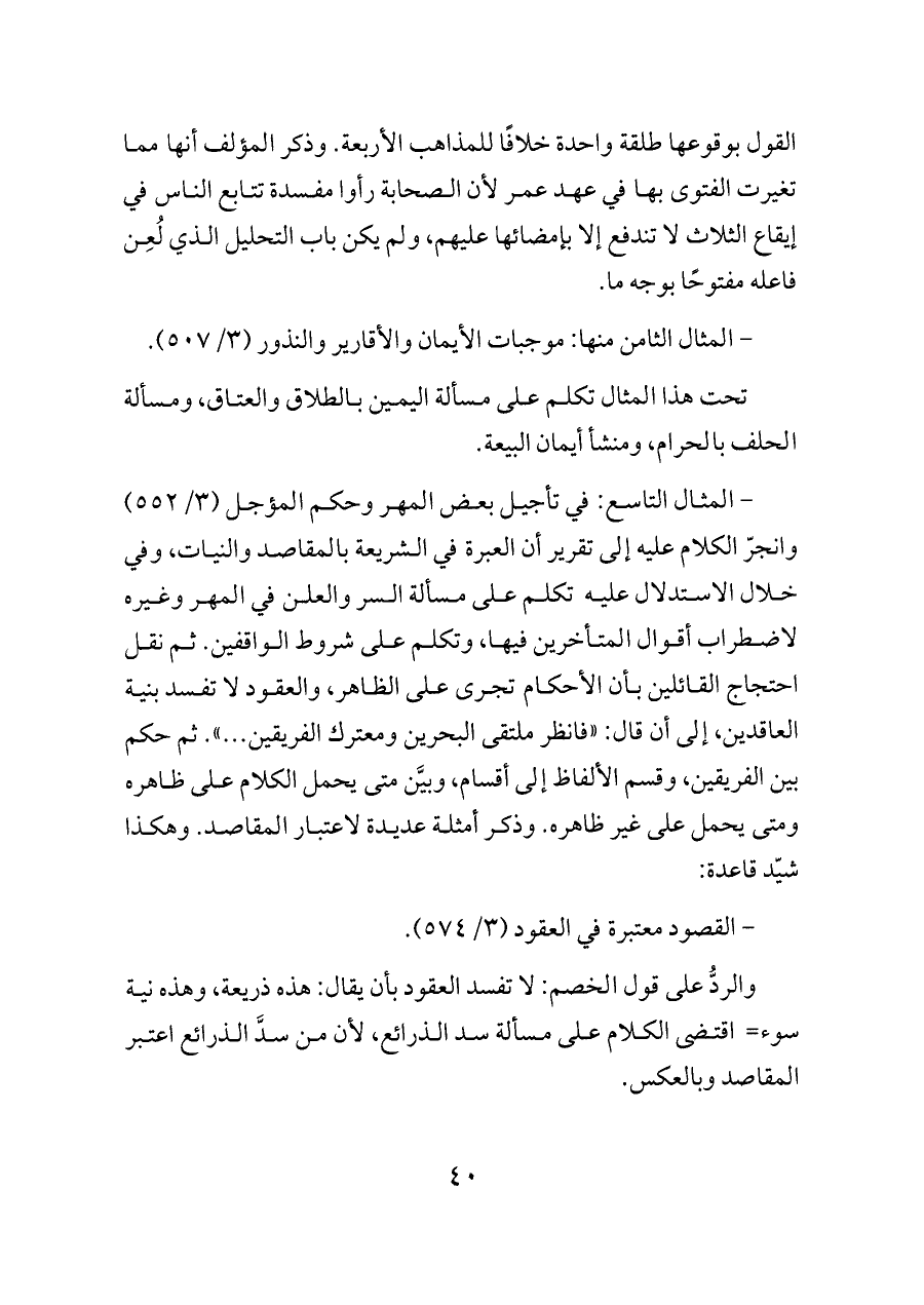 - المثال التاسع: في تأجيل بعض المهر وحكم المؤجل (٣/ ٥٥٢) وانجرّ الكلام عليه إلى تقرير أن العبرة في الشريعة بالمقاصد والنيات، وفي خلال الاستدلال عليه تكلم على مسألة السر والعلن في المهر وغيره لاضطراب أقوال المتأخرين فيها، وتكلم على شروط الواقفين. ثم نقل احتجاج القائلين بأن الأحكام تجرى على الظاهر، والعقود لا تفسد بنية العاقدين، إلى أن قال: «فانظر ملتقى البحرين ومعترك الفريقين ... ». ثم حكم بين الفريقين، وقسم الألفاظ إلى أقسام، وبيَّن متى يحمل الكلام على ظاهره ومتى يحمل على غير ظاهره. وذكر أمثلة عديدة لاعتبار المقاصد. وهكذا شيّد قاعدة: