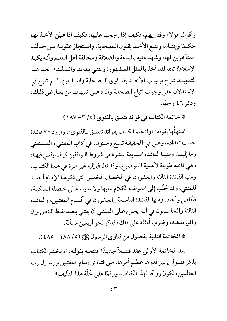 وأقوال هؤلاء وفتاويهم، فكيف إذا رجحها عليها، فكيف إذا عيّن الأخذ بها حكمًا وإفتاء، ومنع الأخذ بقول الصحابة، واستجاز عقوبة من خالف المتأخرين لها، وشهد عليه بالبدعة والضلالة ومخالفة أهل العلم وأنه يكيد الإسلام؟ تالله لقد أخذ بالمثل المشهور: رمتني بدائها وانسلت». بعد هذا التمهيد شرح ترتيب الأخذ بفتاوى الصحابة والتابعين. ثم شرع في الاستدلال على وجوب اتباع الصحابة والرد على شبهات من يعارض ذلك، وذكر ٤٦ وجهًا.