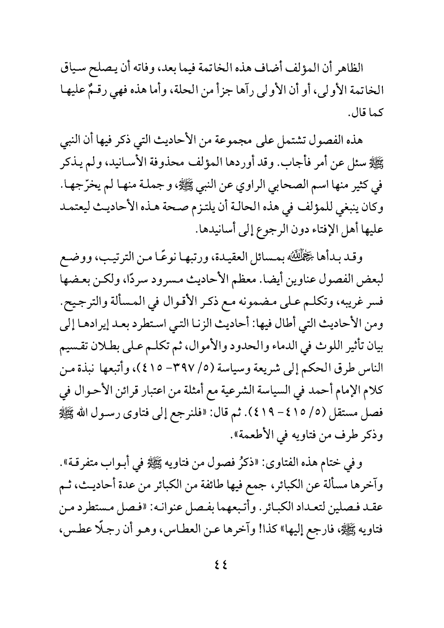 هذه الفصول تشتمل على مجموعة من الأحاديث التي ذكر فيها أن النبي - صلى الله عليه وسلم - سئل عن أمر فأجاب. وقد أوردها المؤلف محذوفة الأسانيد، ولم يذكر في كثير منها اسم الصحابي الراوي عن النبي - صلى الله عليه وسلم -، وجملة منها لم يخرّجها. وكان ينبغي للمؤلف في هذه الحالة أن يلتزم صحة هذه الأحاديث ليعتمد عليها أهل الإفتاء دون الرجوع إلى أسانيدها.