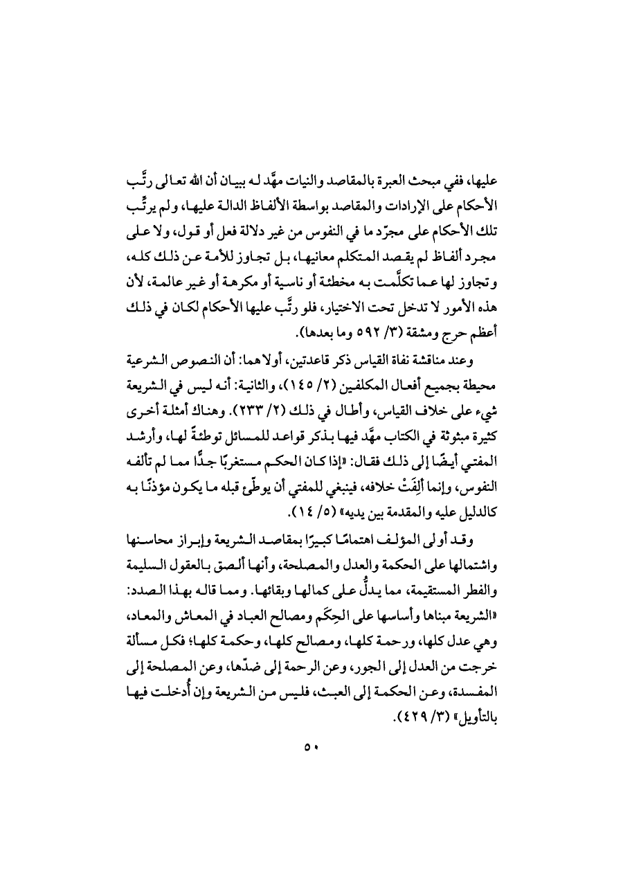 عليها، ففي مبحث العبرة بالمقاصد والنيات مهَّد له ببيان أن الله تعالى رتَّب الأحكام على الإرادات والمقاصد بواسطة الألفاظ الدالة عليها، ولم يرتِّب تلك الأحكام على مجرّد ما في النفوس من غير دلالة فعل أو قول، ولا على مجرد ألفاظ لم يقصد المتكلم معانيها، بل تجاوز للأمة عن ذلك كله، وتجاوز لها عما تكلَّمت به مخطئة أو ناسية أو مكرهة أو غير عالمة، لأن هذه الأمور لا تدخل تحت الاختيار، فلو رتَّب عليها الأحكام لكان في ذلك أعظم حرج ومشقة (٣/ ٥٩٢ وما بعدها).
