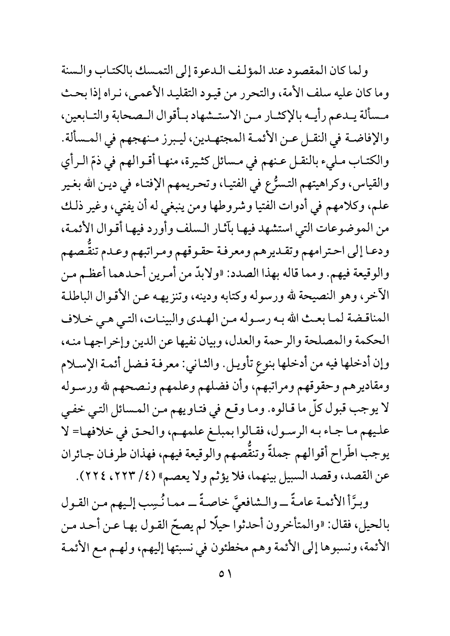ولما كان المقصود عند المؤلف الدعوة إلى التمسك بالكتاب والسنة وما كان عليه سلف الأمة، والتحرر من قيود التقليد الأعمى، نراه إذا بحث مسألة يدعم رأيه بالإكثار من الاستشهاد بأقوال الصحابة والتابعين، والإفاضة في النقل عن الأئمة المجتهدين، ليبرز منهجهم في المسألة. والكتاب مليء بالنقل عنهم في مسائل كثيرة، منها أقوالهم في ذمّ الرأي والقياس، وكراهيتهم التسرُّع في الفتيا، وتحريمهم الإفتاء في دين الله بغير علم، وكلامهم في أدوات الفتيا وشروطها ومن ينبغي له أن يفتي، وغير ذلك من الموضوعات التي استشهد فيها بآثار السلف وأورد فيها أقوال الأئمة، ودعا إلى احترامهم وتقديرهم ومعرفة حقوقهم ومراتبهم وعدم تنقُّصهم والوقيعة فيهم. ومما قاله بهذا الصدد: «ولابدّ من أمرين أحدهما أعظم من الآخر، وهو النصيحة لله ورسوله وكتابه ودينه، وتنزيهه عن الأقوال الباطلة المناقضة لما بعث الله به رسوله من الهدى والبينات، التي هي خلاف الحكمة والمصلحة والرحمة والعدل، وبيان نفيها عن الدين وإخراجها منه، وإن أدخلها فيه من أدخلها بنوعِ تأويل. والثاني: معرفة فضل أئمة الإسلام ومقاديرهم وحقوقهم ومراتبهم، وأن فضلهم وعلمهم ونصحهم لله ورسوله لا يوجب قبول كلّ ما قالوه. وما وقع في فتاويهم من المسائل التي خفي عليهم ما جاء به الرسول، فقالوا بمبلغ علمهم، والحق في خلافها= لا يوجب اطّراح أقوالهم جملةً وتنقُّصهم والوقيعة فيهم، فهذان طرفان جائران عن القصد، وقصد السبيل بينهما، فلا يؤثم ولا يعصم» (٤/ ٢٢٣، ٢٢٤).