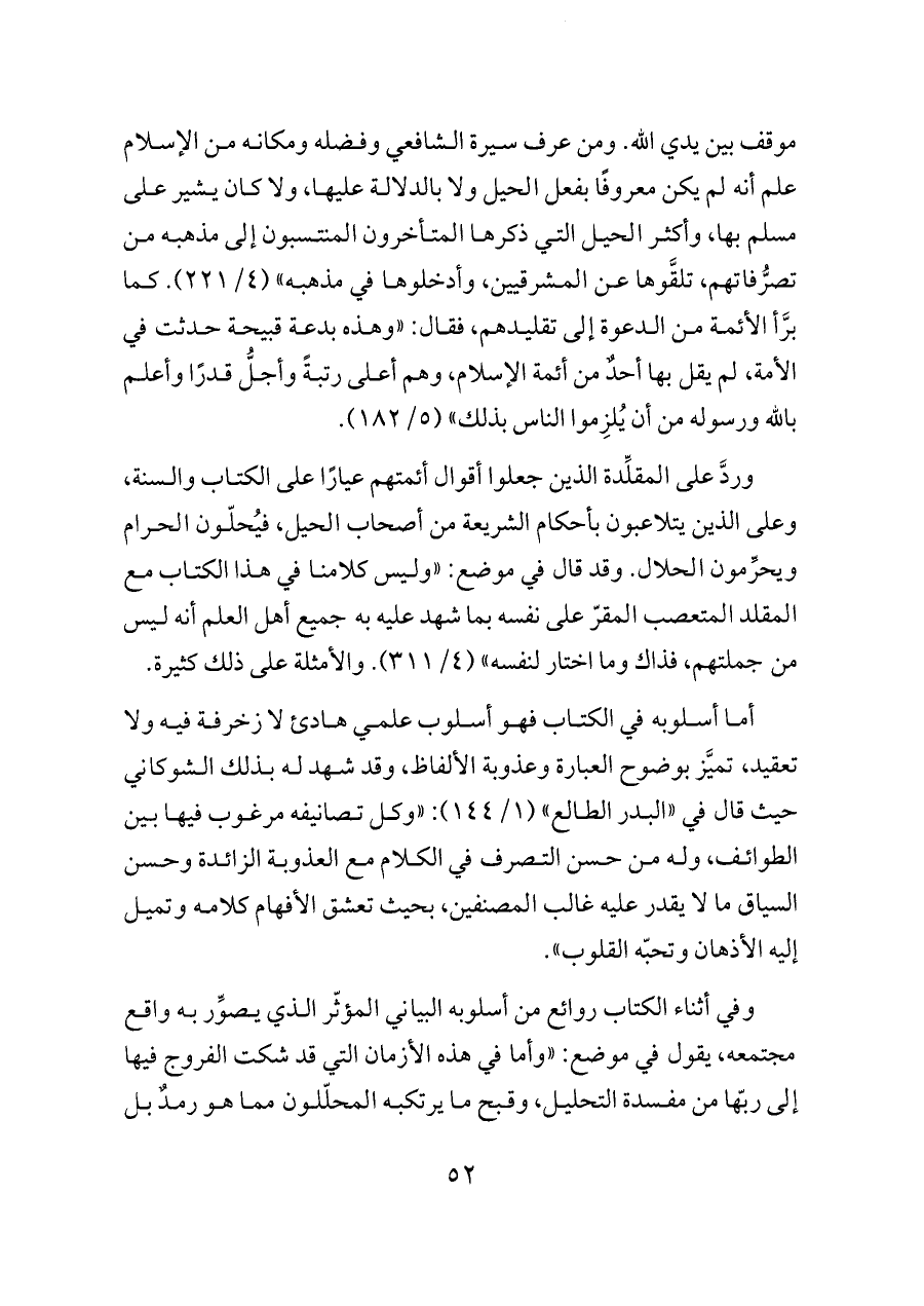 موقف بين يدي الله. ومن عرف سيرة الشافعي وفضله ومكانه من الإسلام علم أنه لم يكن معروفًا بفعل الحيل ولا بالدلالة عليها، ولا كان يشير على مسلم بها، وأكثر الحيل التي ذكرها المتأخرون المنتسبون إلى مذهبه من تصرُّفاتهم، تلقَّوها عن المشرقيين، وأدخلوها في مذهبه» (٤/ ٢٢١). كما برَّأ الأئمة من الدعوة إلى تقليدهم، فقال: «وهذه بدعة قبيحة حدثت في الأمة، لم يقل بها أحدٌ من أئمة الإسلام، وهم أعلى رتبةً وأجلُّ قدرًا وأعلم بالله ورسوله من أن يُلزِموا الناس بذلك» (٥/ ١٨٢).