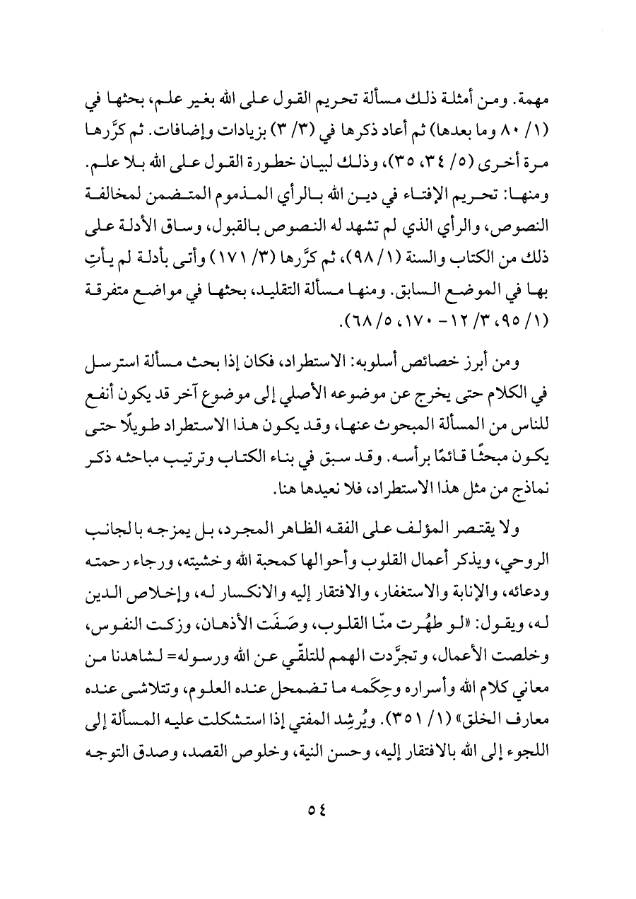 مهمة. ومن أمثلة ذلك مسألة تحريم القول على الله بغير علم، بحثها في (١/ ٨٠ وما بعدها) ثم أعاد ذكرها في (٣/ ٣) بزيادات وإضافات. ثم كرَّرها مرة أخرى (٥/ ٣٤، ٣٥)، وذلك لبيان خطورة القول على الله بلا علم. ومنها: تحريم الإفتاء في دين الله بالرأي المذموم المتضمن لمخالفة النصوص، والرأي الذي لم تشهد له النصوص بالقبول، وساق الأدلة على ذلك من الكتاب والسنة (١/ ٩٨)، ثم كرَّرها (٣/ ١٧١) وأتى بأدلة لم يأتِ بها في الموضع السابق. ومنها مسألة التقليد، بحثها في مواضع متفرقة (١/ ٩٥، ٣/ ١٢ - ١٧٠، ٥/ ٦٨).