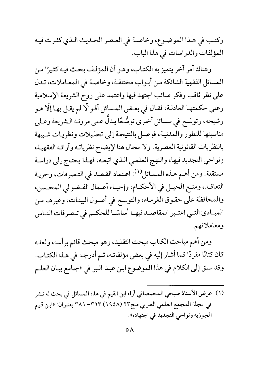 (¬١) عرض الأستاذ صبحي المحمصاني آراء ابن القيم في هذه المسائل في بحث له نشر في مجلة المجمع العلمي العربي مج ٢٣ (١٩٤٨) ٣٦٣ - ٣٨١ بعنوان: «ابن قيم الجوزية ونواحي التجديد في اجتهاده».