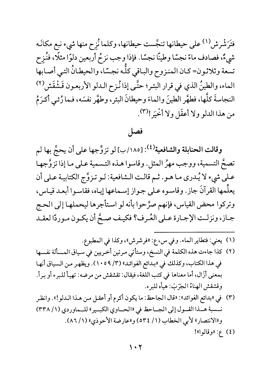 (¬٣) في «بدائع الفوائد»: «قال الجاحظ: ما يكون أكرم أو أعقل من هذا الدلو!». وانظر نسبة هذا القول إلى الجاحظ في «الحاوي الكبير» للماوردي (١/ ٣٣٨) و «الانتصار» لأبي الخطاب (١/ ٥٣٤) و «عارضة الأحوذي» (١/ ٨٦).