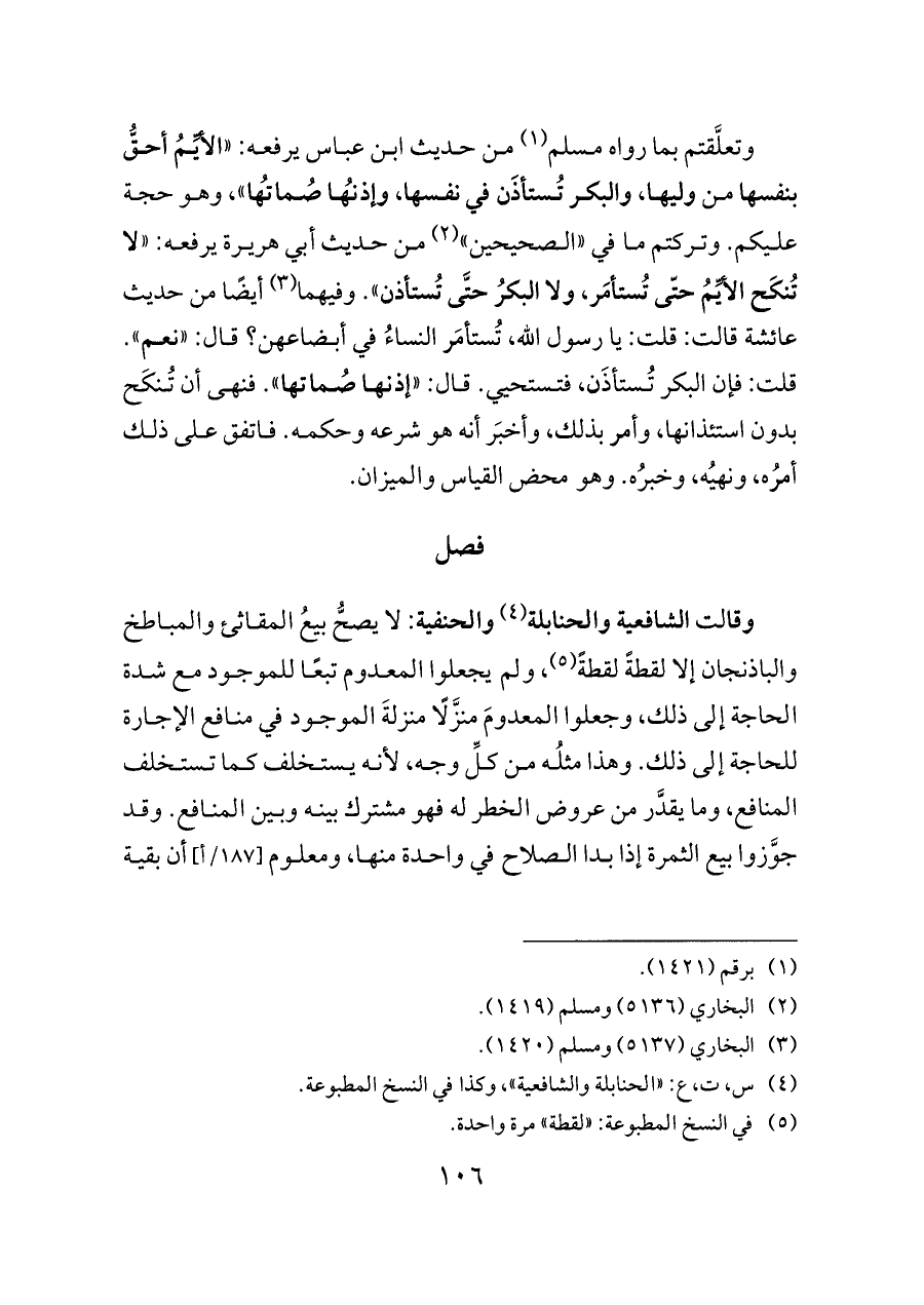 وتعلَّقتم بما رواه مسلم (¬١) من حديث ابن عباس يرفعه: «الأيِّمُ أحقُّ بنفسها من وليها، والبكر تُستأذَن في نفسها، وإذنُها صُماتُها»، وهو حجة عليكم. وتركتم ما في «الصحيحين» (¬٢) من حديث أبي هريرة يرفعه: «لا تُنكَح الأيِّمُ حتّى تُستأمَر، ولا البكرُ حتَّى تُستأذن». وفيهما (¬٣) أيضًا من حديث عائشة قالت: قلت: يا رسول الله، تُستأمَر النساءُ في أبضاعهن؟ قال: «نعم». قلت: فإن البكر تُستأذَن، فتستحيي. قال: «إذنها صُماتها». فنهى أن تُنكَح بدون استئذانها، وأمر بذلك، وأخبَر أنه هو شرعه وحكمه. فاتفق على ذلك أمرُه، ونهيُه، وخبرُه. وهو محض القياس والميزان.