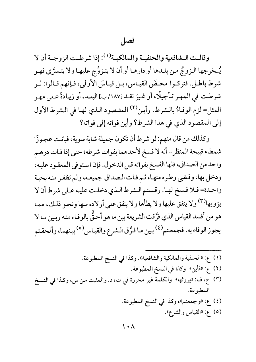 وقالت الشافعية والحنفية والمالكية (¬١): إذا شرطت الزوجة أن لا يُخرجها الزوجُ من بلدها أو دارها أو أن لا يتزوَّج عليها ولا يتسرَّى فهو شرط باطل. فتركوا محضَ القياس، بل قياسَ الأولى، فإنهم قالوا: لو شرطت في المهر تأجيلًا، أو غيرَ نقد [١٨٧/ب] البلد، أو زيادةً على مهر المثل= لزم الوفاءُ بالشرط. وأين (¬٢) المقصود الذي لها في الشرط الأول إلى المقصود الذي في هذا الشرط؟ وأين فواته إلى فواته؟