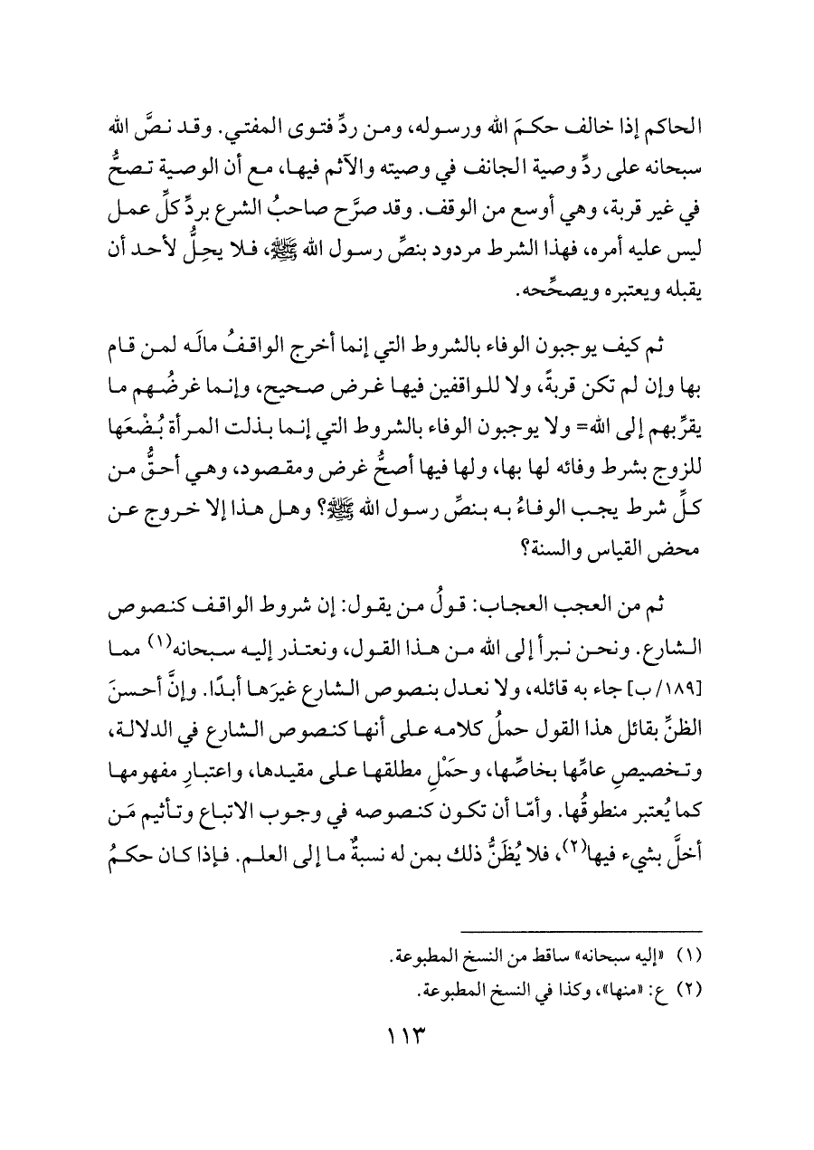 الحاكم إذا خالف حكمَ الله ورسوله، ومن ردِّ فتوى المفتي. وقد نصَّ الله سبحانه على ردِّ وصية الجانف في وصيته والآثم فيها، مع أن الوصية تصحُّ في غير قربة، وهي أوسع من الوقف. وقد صرَّح صاحبُ الشرع بردِّ كلِّ عمل ليس عليه أمره، فهذا الشرط مردود بنصِّ رسول الله - صلى الله عليه وسلم -، فلا يحِلُّ لأحد أن يقبله ويعتبره ويصحِّحه.