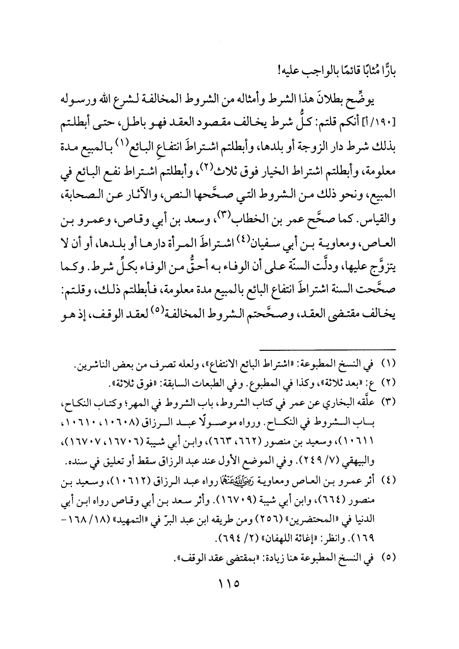 يوضِّح بطلانَ هذا الشرط وأمثاله من الشروط المخالفة لشرع الله ورسوله [١٩٠/أ] أنكم قلتم: كلُّ شرط يخالف مقصود العقد فهو باطل، حتى أبطلتم بذلك شرط دار الزوجة أو بلدها، وأبطلتم اشتراطَ انتفاعِ البائع (¬١) بالمبيع مدة معلومة، وأبطلتم اشتراط الخيار فوق ثلاث (¬٢)، وأبطلتم اشتراط نفع البائع في المبيع، ونحو ذلك من الشروط التي صحَّحها النص، والآثار عن الصحابة، والقياس. كما صحَّح عمر بن الخطاب (¬٣)، وسعد بن أبي وقاص، وعمرو بن العاص، ومعاوية بن أبي سفيان (¬٤) اشتراطَ المرأة دارها أو بلدها، أو أن لا يتزوَّج عليها، ودلَّت السنّة على أن الوفاء به أحقُّ من الوفاء بكلِّ شرط. وكما صحَّحت السنة اشتراطَ انتفاع البائع بالمبيع مدة معلومة، فأبطلتم ذلك، وقلتم: يخالف مقتضى العقد، وصحَّحتم الشروط المخالفة (¬٥) لعقد الوقف، إذ هو