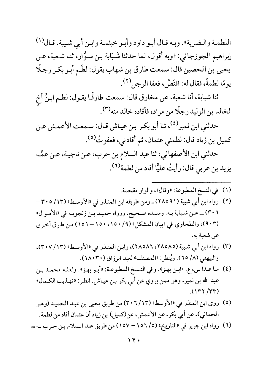 (¬٥) روى ابن المنذر في «الأوسط» (١٣/ ٣٠٦) من طريق يحيى بن عبد الحميد (وهو الحماني)، عن أبي بكر، عن الأعمش، عن (كميل) بن زياد أن عثمان أقاد من لطمة.