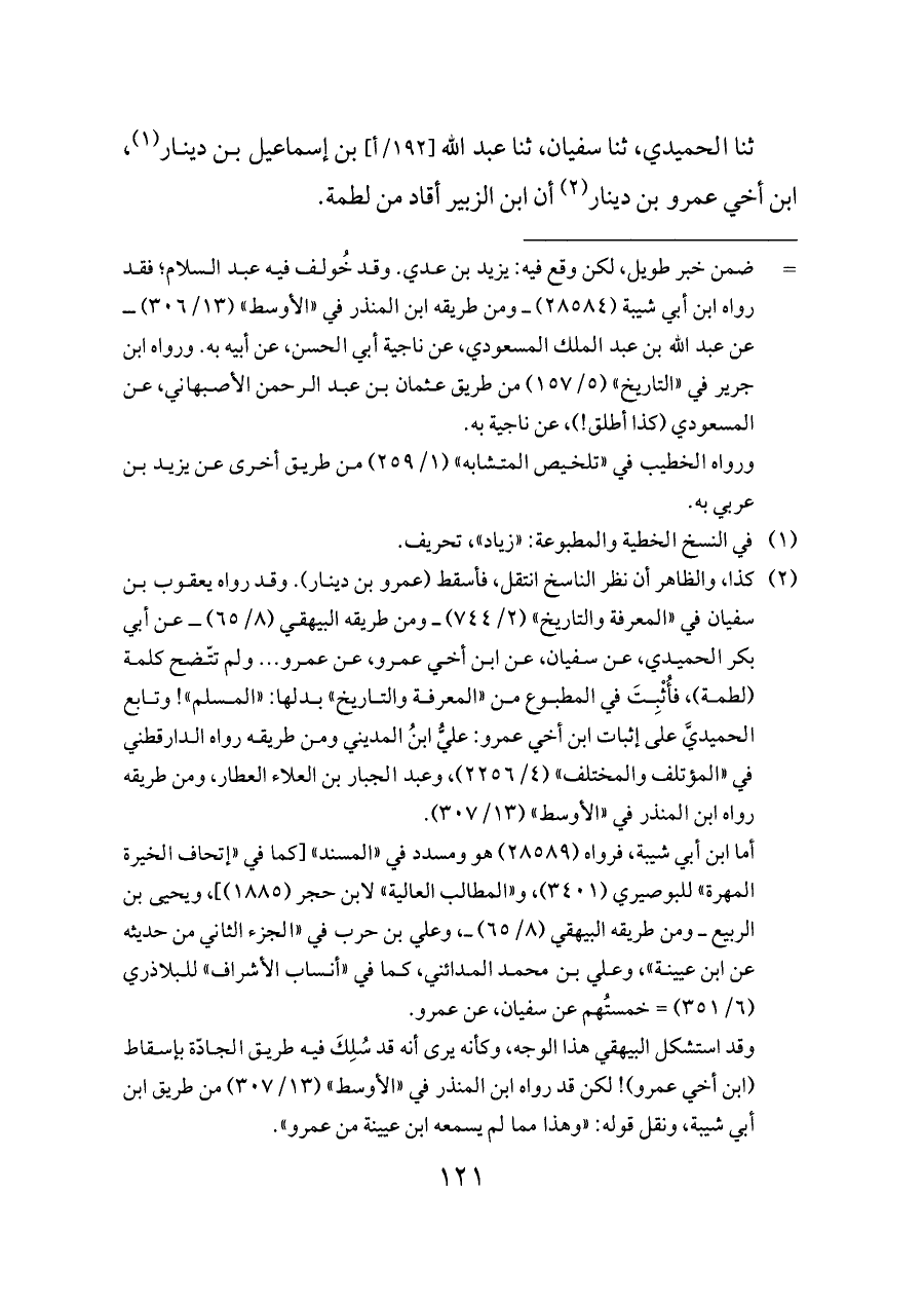 وقد استشكل البيهقي هذا الوجه، وكأنه يرى أنه قد سُلِكَ فيه طريق الجادّة بإسقاط (ابن أخي عمرو)! لكن قد رواه ابن المنذر في «الأوسط» (١٣/ ٣٠٧) من طريق ابن أبي شيبة، ونقل قوله: «وهذا مما لم يسمعه ابن عيينة من عمرو».