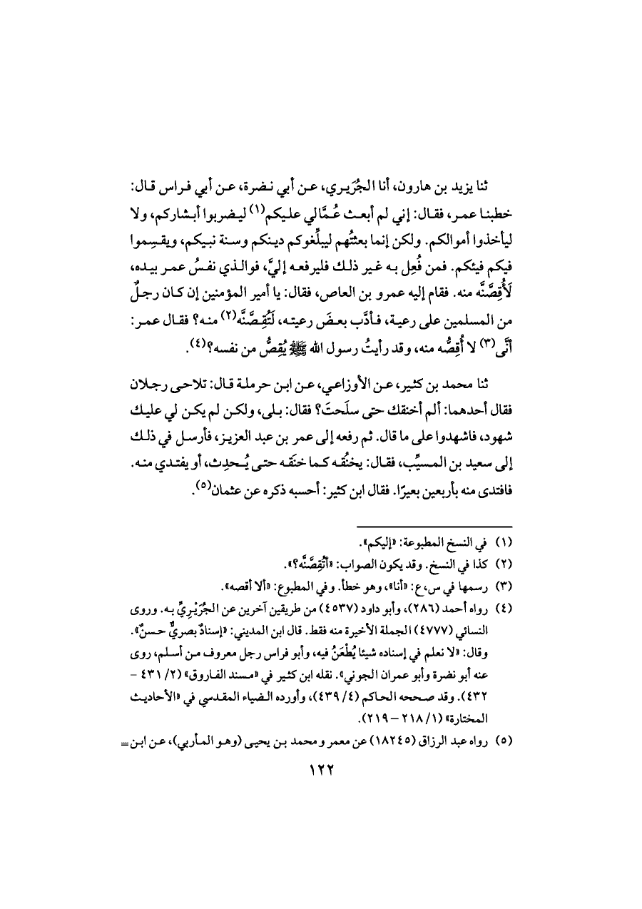 ثنا يزيد بن هارون، أنا الجُرَيري، عن أبي نضرة، عن أبي فراس قال: خطبنا عمر، فقال: إني لم أبعث عُمَّالي عليكم (¬١) ليضربوا أبشاركم، ولا ليأخذوا أموالكم. ولكن إنما بعثتُهم ليبلِّغوكم دينكم وسنة نبيكم، ويقسِموا فيكم فيئكم. فمن فُعِل به غير ذلك فليرفعه إليَّ، فوالذي نفسُ عمر بيده، لَأُقِصَّنَّه منه. فقام إليه عمرو بن العاص، فقال: يا أمير المؤمنين إن كان رجلٌ من المسلمين على رعية، فأدَّب بعضَ رعيته، لَتُقِصَّنَّه (¬٢) منه؟ فقال عمر: أنَّى (¬٣) لا أُقِصُّه منه، وقد رأيتُ رسول الله - صلى الله عليه وسلم - يُقِصُّ من نفسه؟ (¬٤).