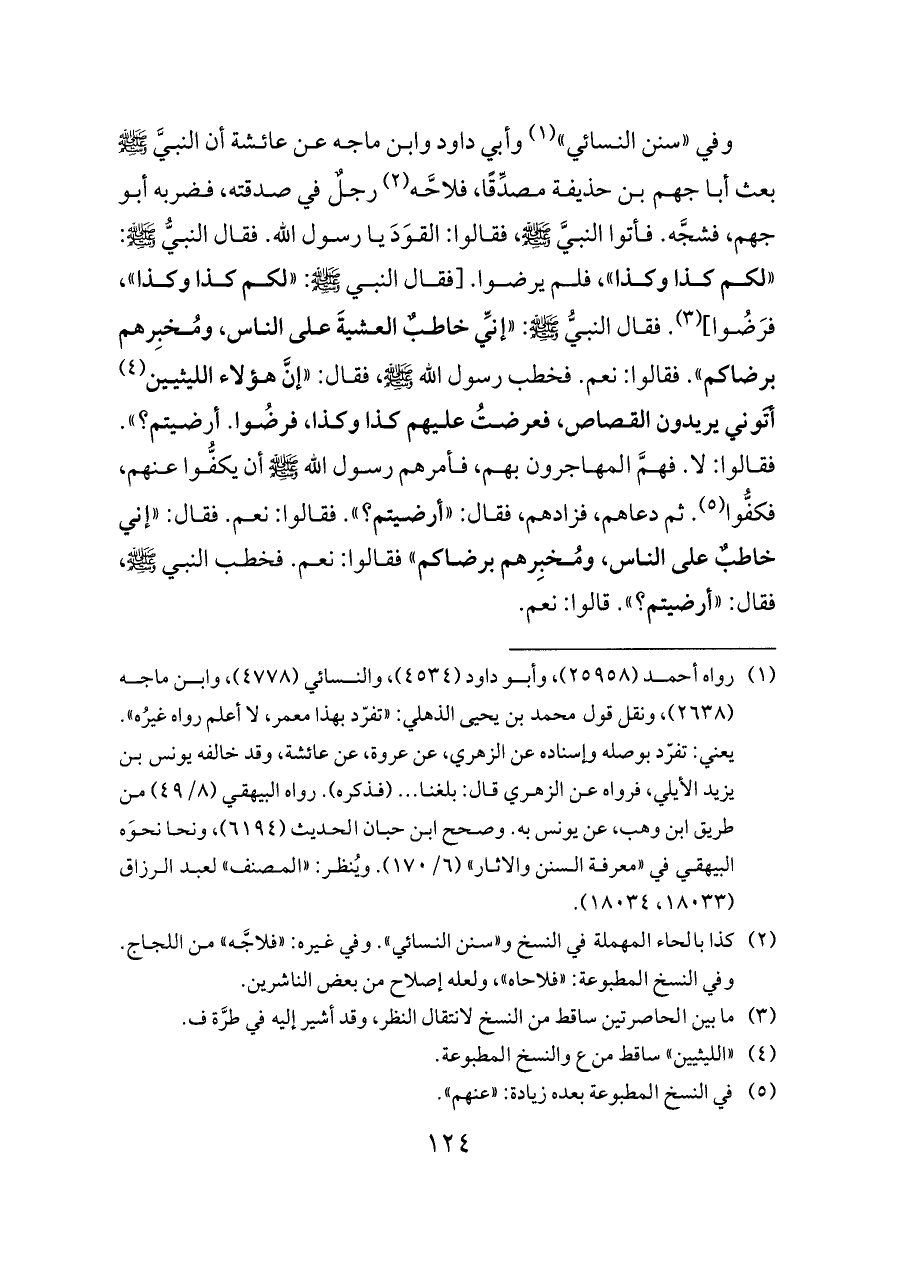 وفي «سنن النسائي» (¬١) وأبي داود وابن ماجه عن عائشة أن النبيَّ - صلى الله عليه وسلم - بعث أبا جهم بن حذيفة مصدِّقًا، فلاحَّه (¬٢) رجلٌ في صدقته، فضربه أبو جهم، فشجَّه. فأتوا النبيَّ - صلى الله عليه وسلم -، فقالوا: القوَدَ يا رسول الله. فقال النبيُّ - صلى الله عليه وسلم -: «لكم كذا وكذا»، فلم يرضوا. [فقال النبي - صلى الله عليه وسلم -: «لكم كذا وكذا»، فرَضُوا] (¬٣). فقال النبيُّ - صلى الله عليه وسلم -: «إنِّي خاطبٌ العشيةَ على الناس، ومُخبِرهم برضاكم». فقالوا: نعم. فخطب رسول الله - صلى الله عليه وسلم -، فقال: «إنَّ هؤلاء الليثيين (¬٤) أتَوني يريدون القصاص، فعرضتُ عليهم كذا وكذا، فرضُوا. أرضيتم؟». فقالوا: لا. فهمَّ المهاجرون بهم، فأمرهم رسول الله - صلى الله عليه وسلم - أن يكفُّوا عنهم، فكفُّوا (¬٥). ثم دعاهم، فزادهم، فقال: «أرضيتم؟». فقالوا: نعم. فقال: «إني خاطبٌ على الناس، ومُخبِرهم برضاكم» فقالوا: نعم. فخطب النبي - صلى الله عليه وسلم -، فقال: «أرضيتم؟». قالوا: نعم.