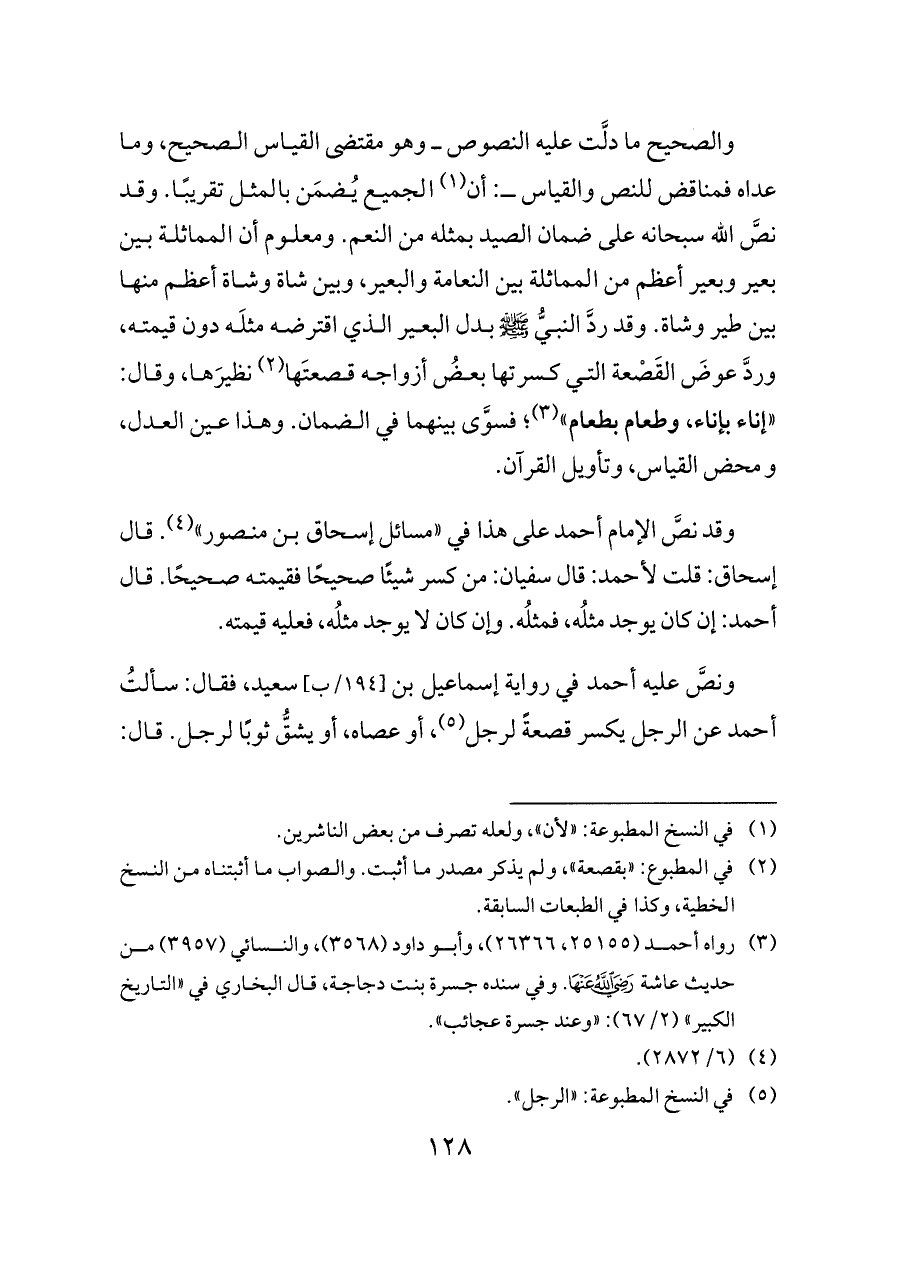 وقد نصَّ الإمام أحمد على هذا في «مسائل إسحاق بن منصور» (¬٤). قال إسحاق: قلت لأحمد: قال سفيان: من كسر شيئًا صحيحًا فقيمته صحيحًا. قال أحمد: إن كان يوجد مثلُه، فمثلُه. وإن كان لا يوجد مثلُه، فعليه قيمته.